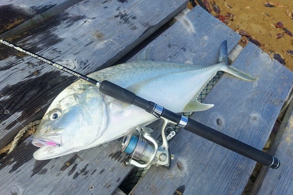 | 上原航路は朝から欠航。波4mまで上がる予報でしたが、朝の海は波はなくいい天気です。安全第一で今日は船を出さずに陸からツアー。マングローブ、河口を回りキャスティングでご案内です。 釣果は納得のオニヒラアジです!満ち潮のタイミングで海から大量のミジュンが河口に入って来ています。その群れの中をベイトと同じサイズのワームを通したら1撃でした。 PE0.8号、リーダーはナイロンの4号。素晴らしい竿さばき、ファイト時間は3分、見事釣り上げてくれました。 |