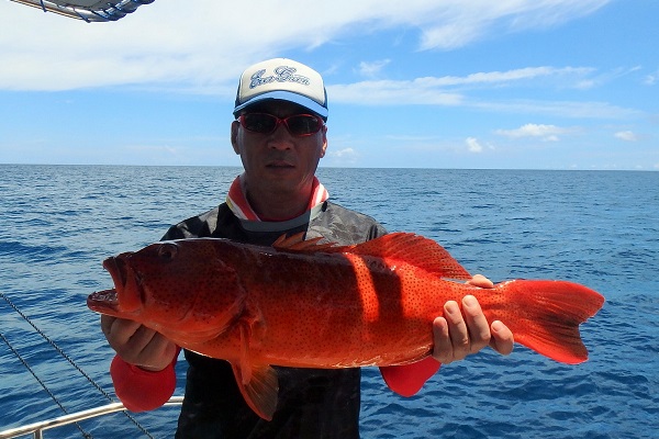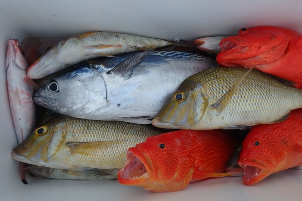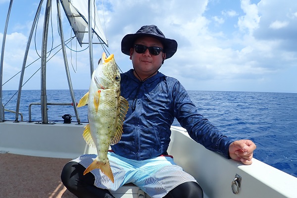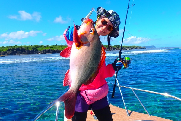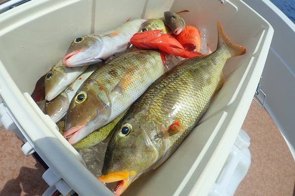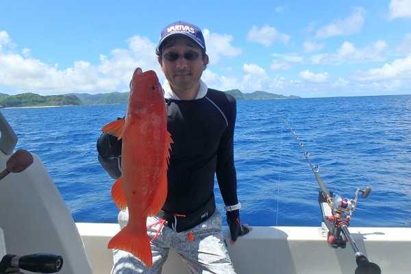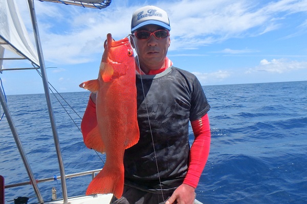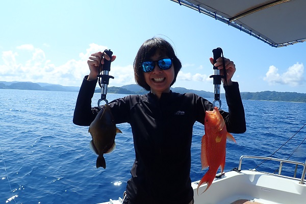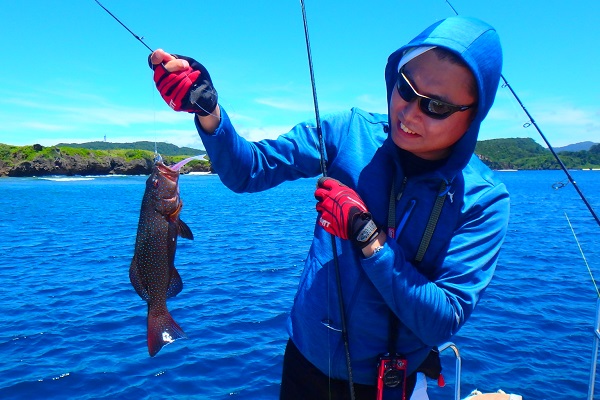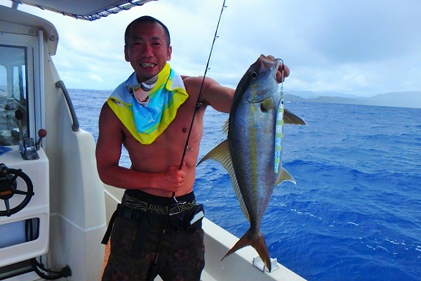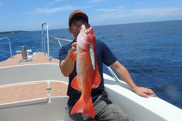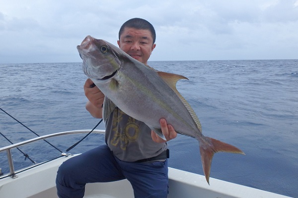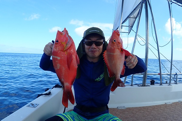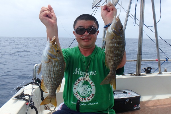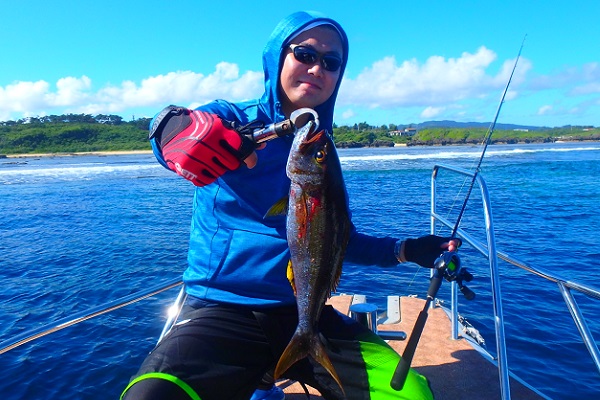 | まだまだ波・風が残り大時化の西表島。静かなポイントまで行き、泳がせ釣りです。まずはグルクン釣りですが・・・。 大小さまざまなサイズのグルクンが調子良く釣れました。 いよいよアカジンポイントへ行き、泳がせスタート。 早合わせや、送りこみ不足で魚がなかなか最後まで食い込まず初めての泳がせ釣りは大苦戦です。生餌だからと言って必ず釣果が良いわけではありません。 最終的には泳がせ釣りで良型アカジン、ジギングではツムブリやシロブチハタと納得の釣果でした。船長が! |