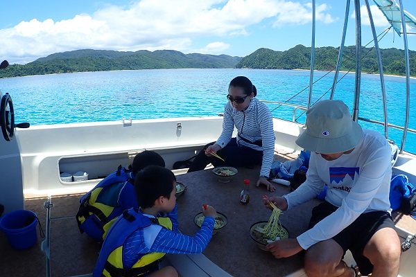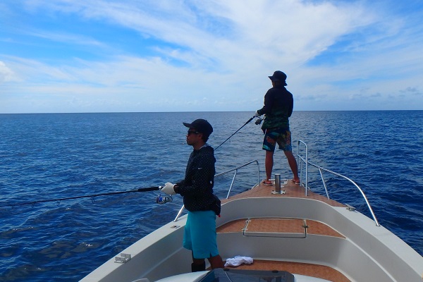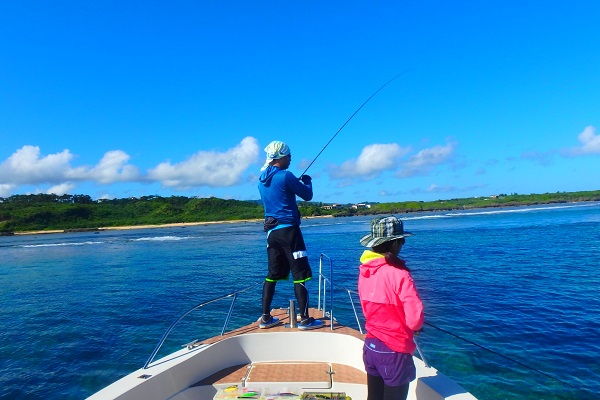 | 昨日のサンセットのお客様が今日は1日チャーターです。 体験フィッシングは昨日行なったので、今日は沖へ出て大物狙いです。海況も良く、船酔いの心配なし! ![]() 昨日はあまり調子の良くなかったお父さんが今日は絶好調です! 1投目から立派なミミジャーのダブルを釣り上げてくれました。 ![]() ![]() みんな昨日の体験フィッシングよりも大きな魚が釣れて良かったです。釣れたお魚はお昼ご飯のソーキそばへ入れていただきました。 ![]() 昼食後は初めてのシュノーケリング。初めてということで、流れや波のないポイントで行います。少し濁りはありましたが、ブダイやスズメダイのたくさん見れてのんびり泳げた様子です。 |