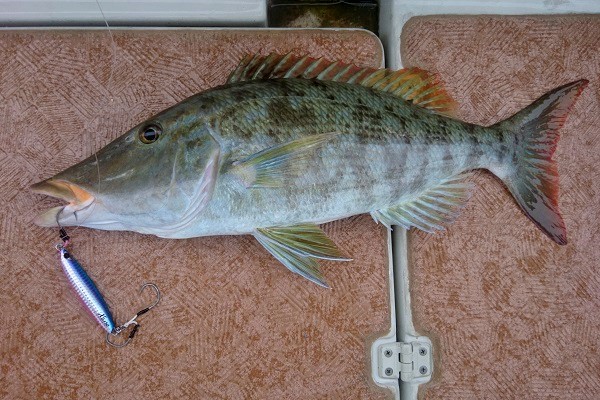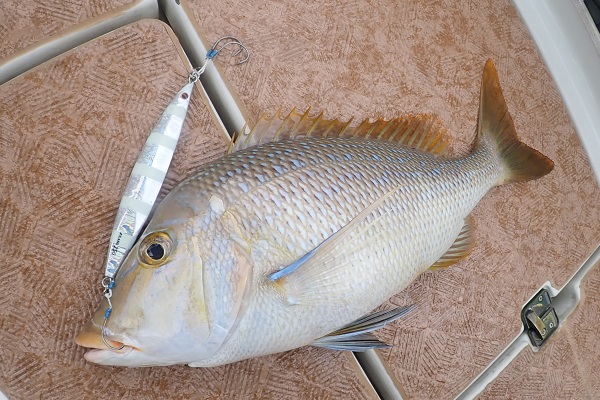 | 今日も北風が強い中、昨日に引き続き湾内でジギングをしてきました。 狙いはオニヒラアジやロウニンアジ!あわよくばアーラミーバイです。ハイピッチやスローを使い分けて狙います。 ![]() 湾内奥の避難ブイ近くでフォールを入れたタイミングで強烈なバイト!PE2号・リーダー40Lbでドラグはかなり締めた状態でしたが、ファーストラン20m出されました。巻いては出されての繰り返しで上がってきたのは約5kgのロウニンアジでした。 その後も2kg前後のロウニンアジがハイピッチで2匹、タイラバでオニヒラアジを釣り上げ、ルアーの反応が良い1日でした。 |