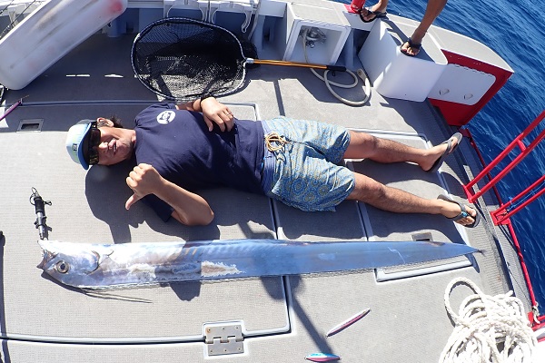 | 11月になり、穏やかな天気が続いている西表島。 今日はお祝い用の魚を釣りに島の先輩達と行って来ました。 まずは水深120mからスタート。大潮の為、潮の流れが早くとっても釣りにくい状況。なるべく潮が流れてないポイントを探して移動です。 その後、110〜130mでカンパチ・アオチビキ・サザナミダイと確保。 ポイントを変え水深150〜300mへ移動。今日は深場が大当たりの日で、水深250mで5kg超えのオオクチハマダイ。 ![]() そしてそのまま300mを超えた所で・・・、 ![]() ![]() 2mはありそうなヒレナガユメタチを先輩が釣り上げました。 タチウオで言うなら指9本の超大型個体!初めて見ました。 その後もキツネフエフキ・イソマグロが連発したりと最高の大潮に当たりました。ちなみに昨日も船を出し、ジギングへ行きましたがまさかのボーズです・・・。大潮は良い日・悪い日はっきり分かれます。 水温も下がり始め、ジギングの良いシーズンがやってきました!! |