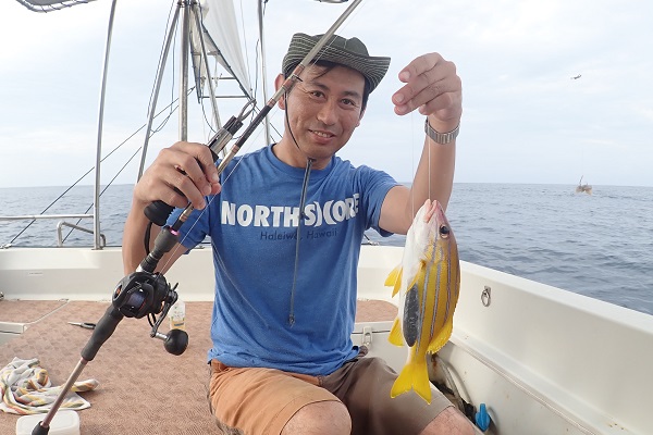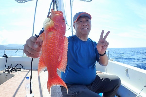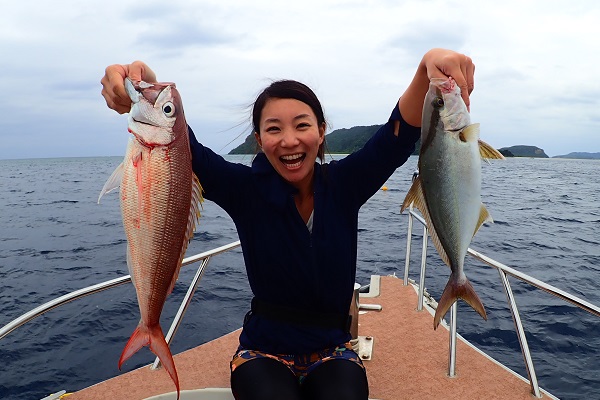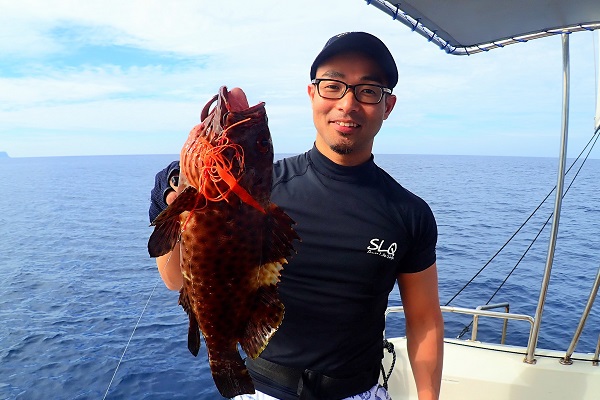 | 北風の強い今日。本日のゲストは島在住のホテルスタッフです。 まずは水深20〜30mで餌釣り。キツネウオやフエフキダイ、バラハタ等小さな魚達に遊んでもらい、大物を求めて少し沖へ移動です。 ![]() 湾内と言っても水深は70〜80m、開始1投目から綺麗なバラハタです。その後もアタリは続き、良型フエフキダイやオジサンなど餌釣りは絶好調です。 ![]() そして餌釣りではまさかのカンパチHIT!!胴付きの4本針エサ釣り仕掛けにオオクチイシチビキ×2、カンパチ×2匹という快挙!そりゃあ重くてなかなか上がって来ない訳だ・・。 その後もカンパチを3匹同時に釣り上げたりで高活性な1日でした。 残念ながらタイラバには反応の悪い1日になりました。 |