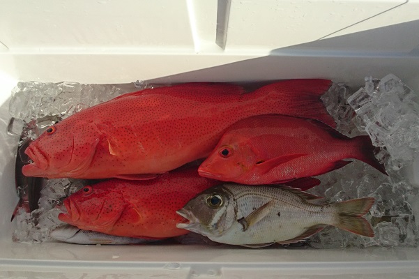 | 今日は居酒屋・明日はBBQを予約して、魚を絶対に釣らないと帰れない状態でご参加していただいたお二人さま。天気も良くなり、賑やかにわいわいと湾内で餌釣りをしてきました。 なぜか二人とも上半身裸で釣り開始。湾内の70〜80mで良型のアザハタ・メイチダイを見事ゲット。 その後も良型メイチダイを追加です。結果、ハタが数種類・メイチダイ・フエフキダイなど2日分の食料を無事確保。美味しく食べて下さいね。 |