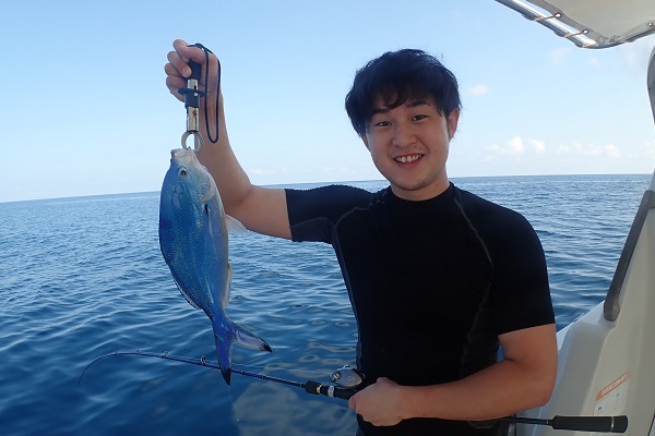 | 台風通過後ようやくツアーへ行って来ました。今日は常連さんの社員旅行です。グルクン釣って、泳がせ釣り体験をして、シュノーケル予定! まずはグルクン釣り!順調にグルクンが釣れ、時にヒラグルクンも混じってきます。そしてこんなに真っ青なヒラグルクンまで登場です。 珍しくPE2号のタックルを持ったと思ったら、スーパーライト泳がせ釣り開始。開始早々変な当たり方だなと思っていたら、ナガジューミーバイのダブルヒットでした。そして本命は、 7.5kgのイソマグロです!1度で良いから膝に魚を乗せて写真を撮りたかったみたいです。写真だけですが・・・。明日も頑張りましょう!! |