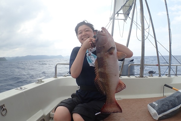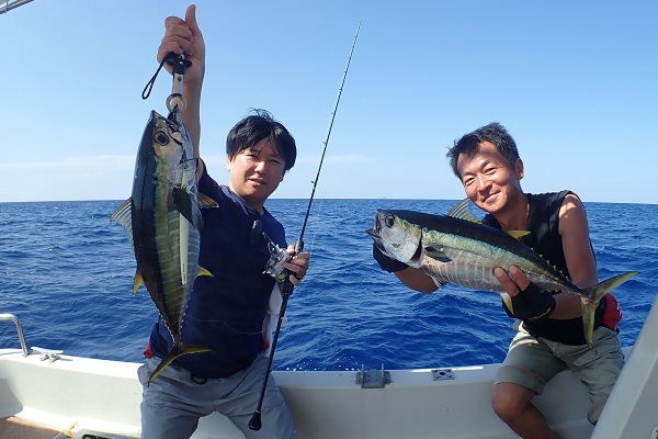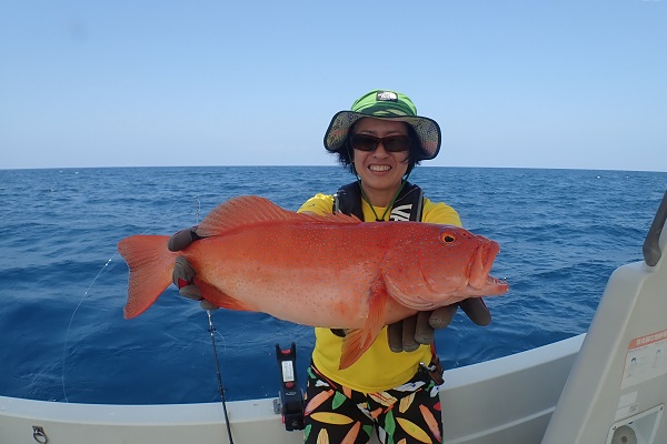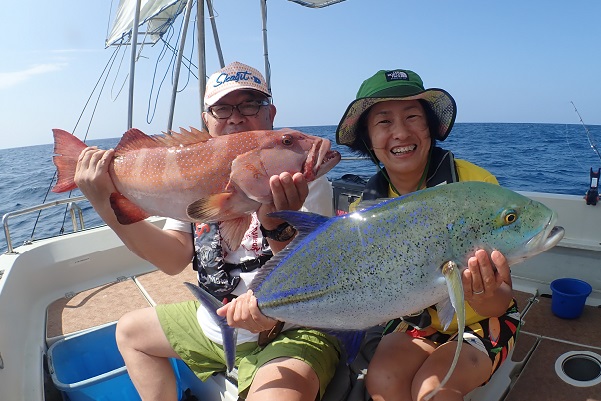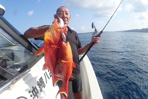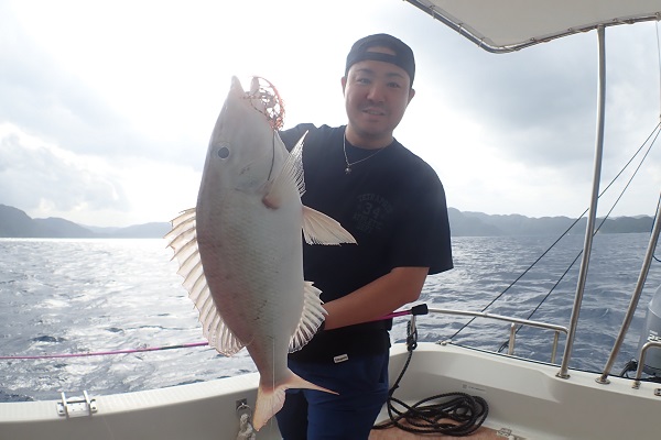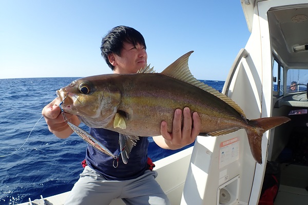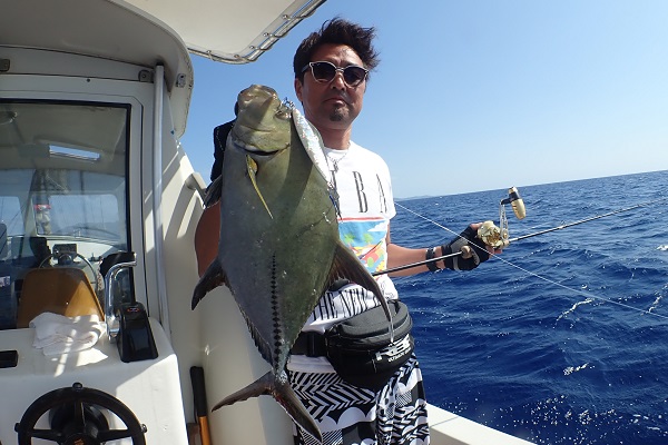| 今日もグルクン泳がせ釣りリクエストのゲスト。昨日のグルクンが余っていたので、そのまま沖へレッツゴー! 開始早々小さ目のナガジューミーバイ。その後あたりが遠のきましたが、しつこく流し直していたら、 コンディションの良いアカジンを見事ゲットです。次の流しでは、 彼女もナイスサイズのアカジンゲット!!無事に2人ともアカジンゲットとなりました。その後、お昼休憩をはさみ再び沖へ行き、 ダメ押しのコクハンアラ!3kgを超える良いサイズ。フッキングから取り込み直前まですべて一人で頑張ってもらいました。 台風の影響もあり、風・波がある状況でしたが1日お疲れ様でした。 魚の食いに助けられ、いい釣果で早上がり。夕食は美味しいのを食べてくださいね。 |