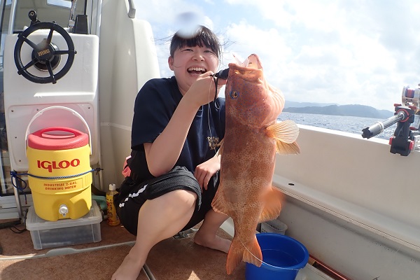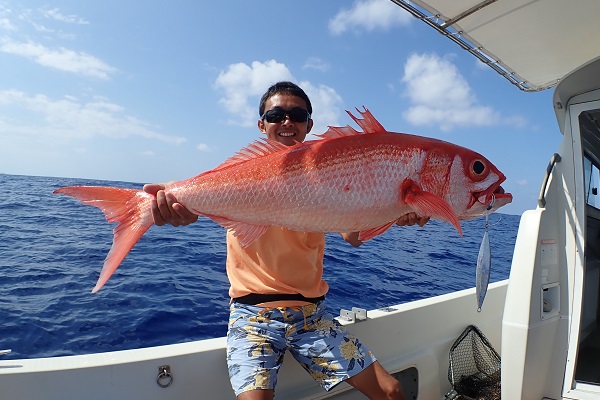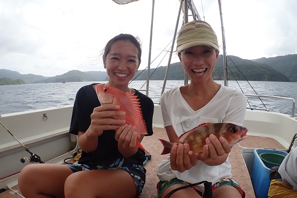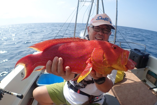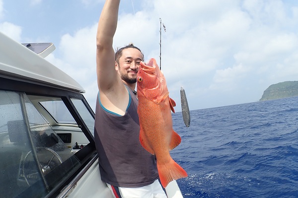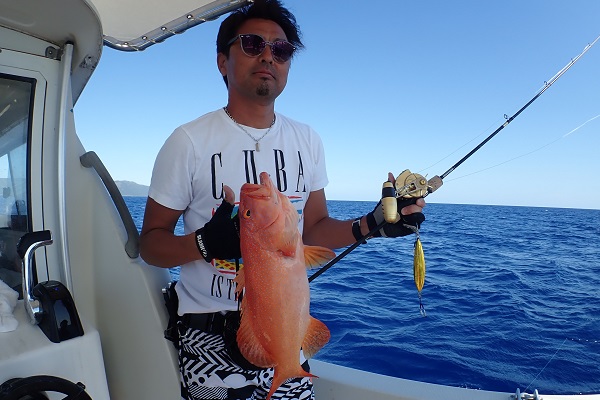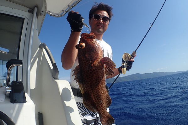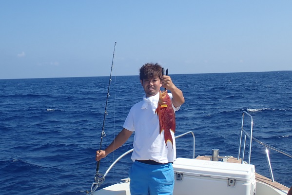 | 天気も良く、風も穏やかになりました。そんな今日は午前・午後と久し振りの体験フィッシングです。まずは午前から〜 1投目から小さな魚が掛かり、それを食べに来た綺麗なアカジン。 港からわずか5分のポイントです。その後は飽きない程度にハタ・キツネウオが釣れました。次回は自分で魚を持って写真が撮れたら良いね! |