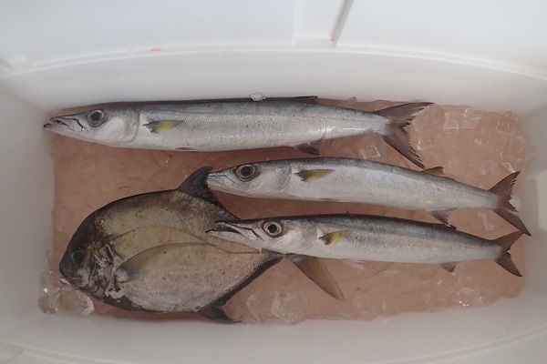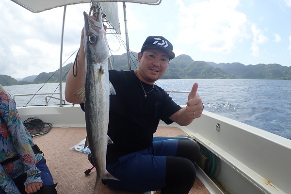 | 今年3回目の来島の常連様。毎回、天候に恵まれないのが悩み・・。 そして今回も波2.5mと沖へ出て釣りをするにはぎりぎりの海況です。 オジサン・グルクンを仕入れて、泳がせ釣りを行なってきました! 沖はうねりも高く、風も強風。魚の活性が高いことを願いながら荒波の中、釣り開始。しかし、うねりが高く上手いこと食い込んでくれず沖での釣りを諦めて湾内へ移動。 湾内泳がせ1投目からアタリがあり、大型オオメカマスを見事ゲット! その後もポイント移動を繰り返しましたが、泳がせ釣りには無反応。 明日が最終日!納得のいく魚釣りましょう!! |