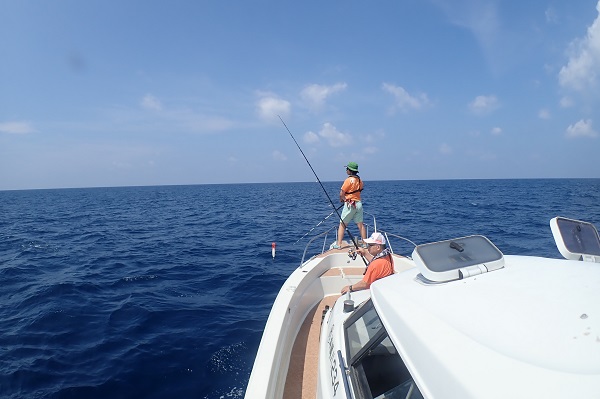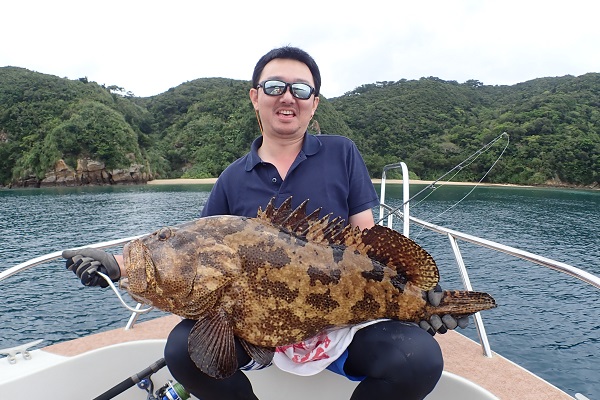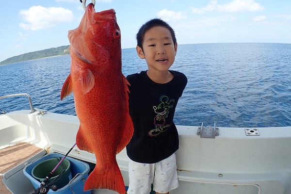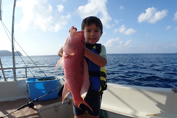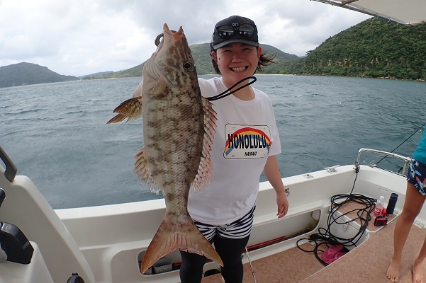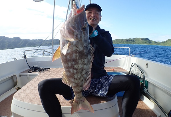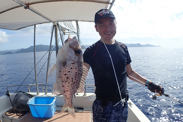 | 午後は香港からお越しのご家族です。まずは、海ガメポイントでカメを見てから釣り開始。午前中よりも食いが悪く苦戦しましたが、 良型ナガジューミーバイ。アタリも小さく、合わせるのが難しい潮。 是非次回は、大物狙って沖へ行きましょうね。 |
