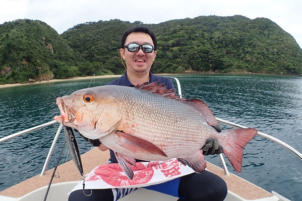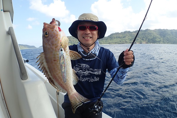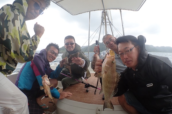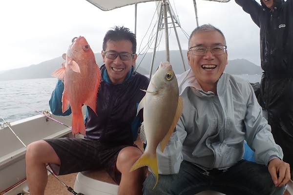 | 今年2回目の来島、リピーター様が新しい仲間達を連れて大人の修学旅行へ来てくれました。しかし生憎の天気ですが、湾内なら釣りが可能なので雨予報ですが雨にも負けず1日頑張ってもらいました。 湾内でもピンポイントで仕掛けを落とせば、色々な魚が釣れます。 ここ最近良く釣れているワキグロアカフエダイとタマガシラのダブルヒットです。 湾内の70mを流せば、オオモンハタ?が1流しで4匹となかなかの魚の活性でした。そして、本日の大物賞は、 40cm超えのメイチダイです。お刺身で食べるととっても美味しいんです!次は更に大人数で?是非お待ちしております。 |