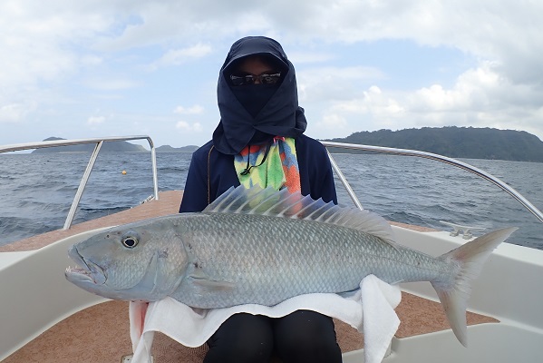 | 予報通り北風に戻ってしまった西表島。昨日の晴れが嘘の様に今日は寒いです!沖へ出て釣りは厳しいので、湾内で大物狙いのタイラバです。 実績のあるポイントを回り、大物探し!なかなか狙って釣れるものでもないですが、今日は海が味方してくれました!!4.5kgの立派なキツネフエフキです。その後も良い型が釣れて、 ぬるぬる系ガーラ、イトヒラアジです。バイト数は少なかったですが、サイズ的に大満足の1日でした。次回は来年の6月ですか!?待ってます! |