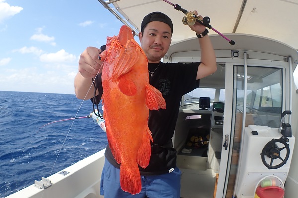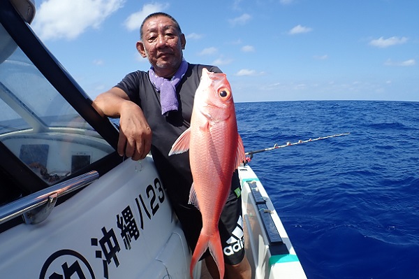| 毎年遊びに来てくれるリピーター様。去年、泳がせ釣りで良い思いをしたので、今年も泳がせ釣りで出船です。しかし、波は3m、ポイントは限られます。 まずはグルクン釣りからスタート。案の定、魚探に反応は出るものの、食いが悪い!ポイントを変えながら12時までに20匹ほど確保。 予報よりも波がないので、少し沖へ出て釣りしてきました。 反応も少なく、大物たちは低活性です。その少ないアタリの中から、なんとか1匹アカジンを釣り上げる事が出来ました。 去年が良すぎたので今年の釣果が悪く感じますが、この時化の中のアカジンは貴重な1匹です。来年も泳がせ釣りでお待ちしております。 |