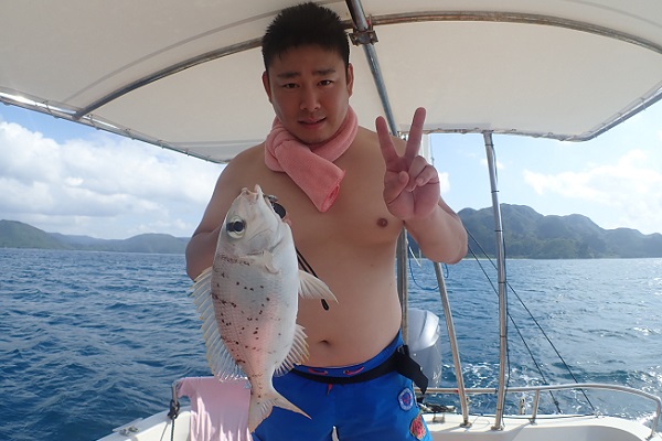 | 今年2回目のリピーターゲスト。前回は1日タイラバで良い釣果だったので、今回は更なる大物を狙って泳がせ釣りへ初挑戦!! の、はずが・・・。グルクンは順調に釣れ、張り切って沖へ出ましたが錘が底に着いたのが分からず根掛かりの嵐。釣りにならないと判断して、急遽餌釣りへ変更!! やっている内にアワセも上手くなり、シロダイを見事GET!! 結局、船長が泳がせ釣りでアカジンを釣りお客様へプレゼント。 美味しい晩ご飯にして下さいね。明日は少し海が時化るので湾内で1日頑張りましょうね。 |