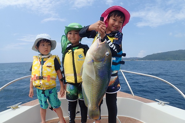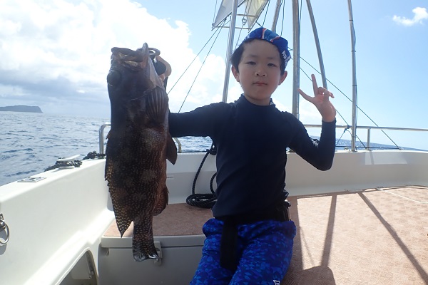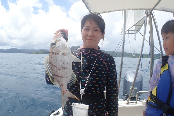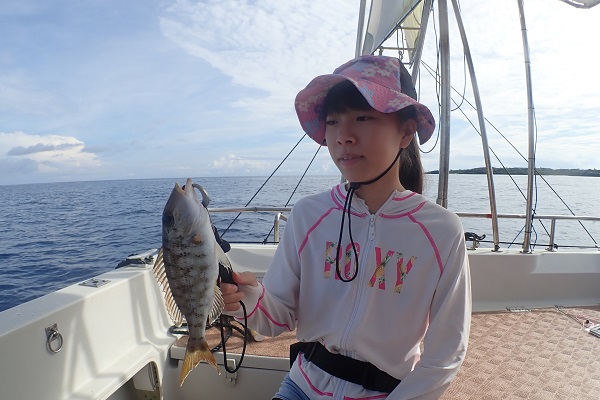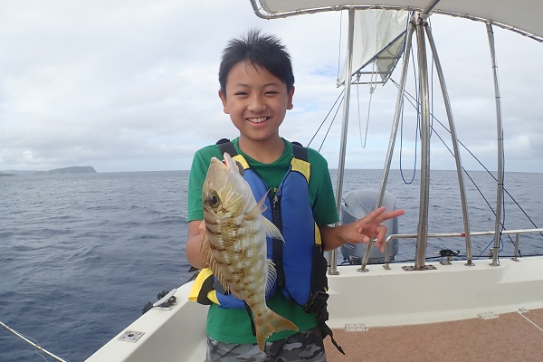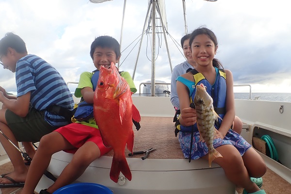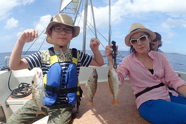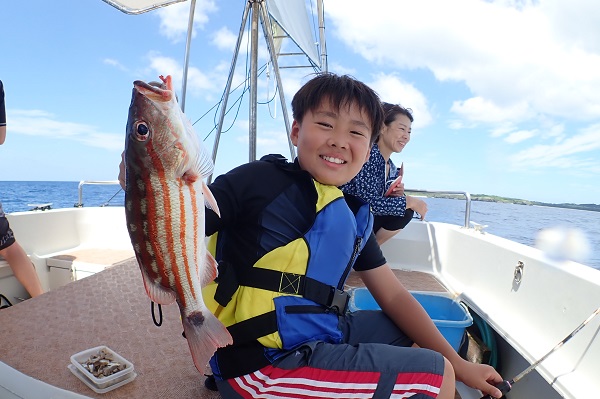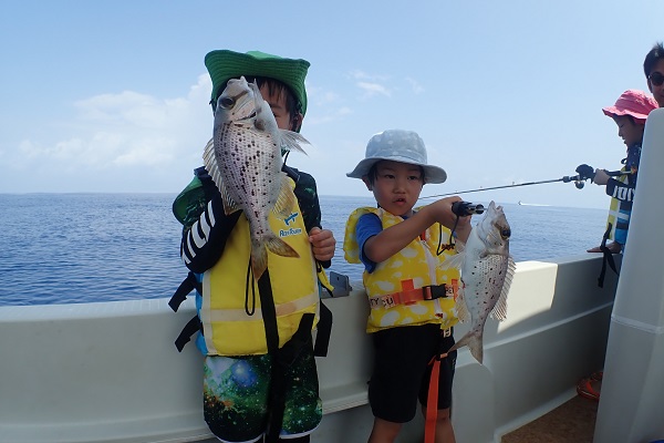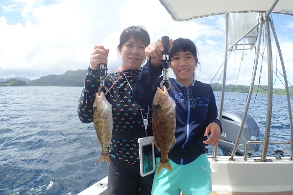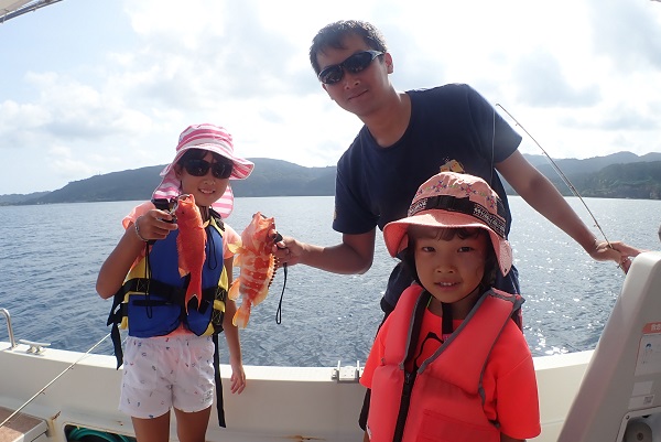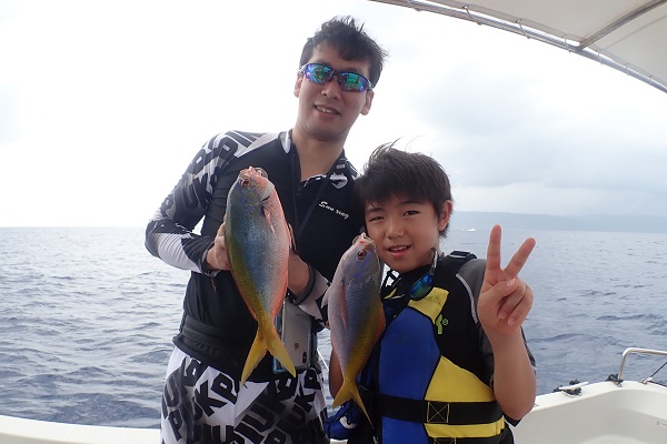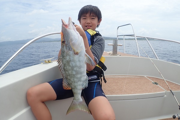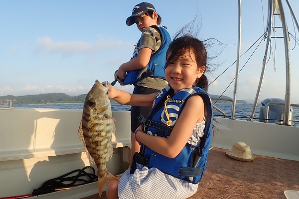 | いつもは岸から釣りをしているご家族。今年は船釣りに初挑戦です。 台風の影響もあり、沖はうねりがあるので湾内で体験フィッシングです。 キツネウオ・ベラ・ハタ数種類、フエフキダイにジョーフィッシュと種類多くたくさんの魚が釣れました。ラスト1時間は少し沖へ出てチャレンジ。 湾内に比べて釣れるサイズも2回り大きいのが釣れます。また来年も釣りに行けたら良いですね〜。 |