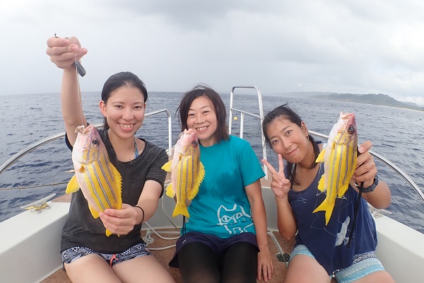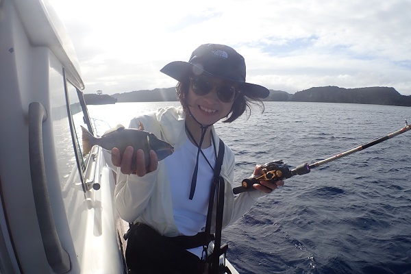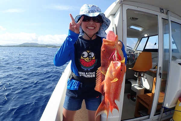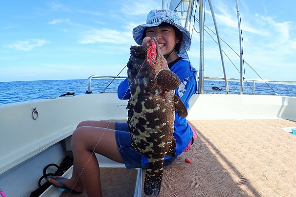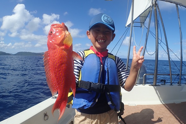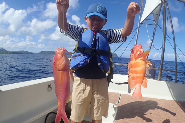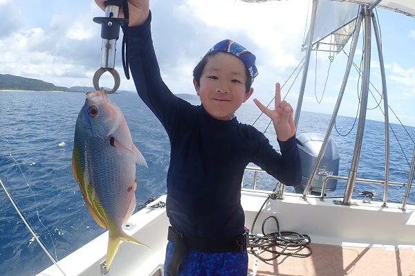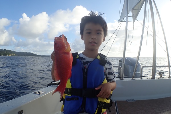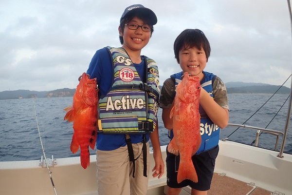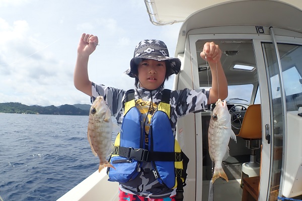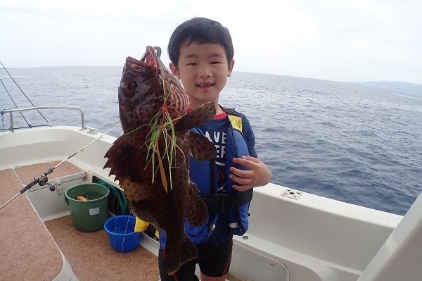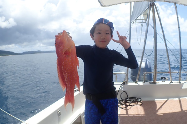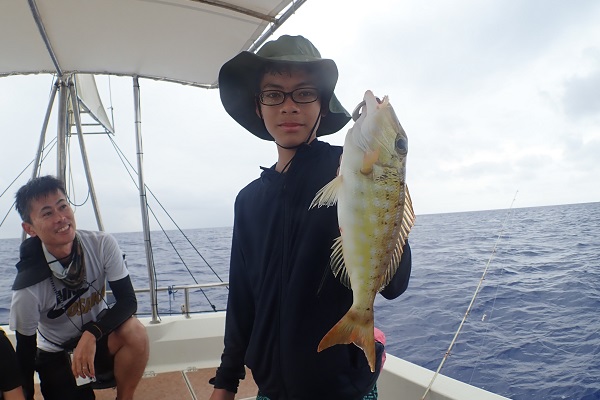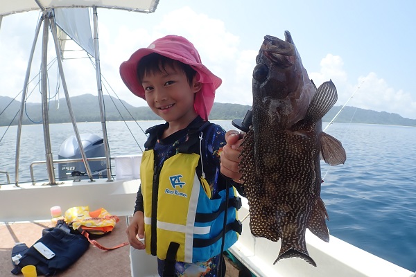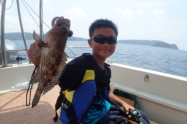 | いつもは岸から釣りをしているご家族。今年は船釣りに初挑戦です。 台風の影響もあり、沖はうねりがあるので湾内で体験フィッシングです。 キツネウオ・ベラ・ハタ数種類、フエフキダイにジョーフィッシュと種類多くたくさんの魚が釣れました。ラスト1時間は少し沖へ出てチャレンジ。 湾内に比べて釣れるサイズも2回り大きいのが釣れます。また来年も釣りに行けたら良いですね〜。 |