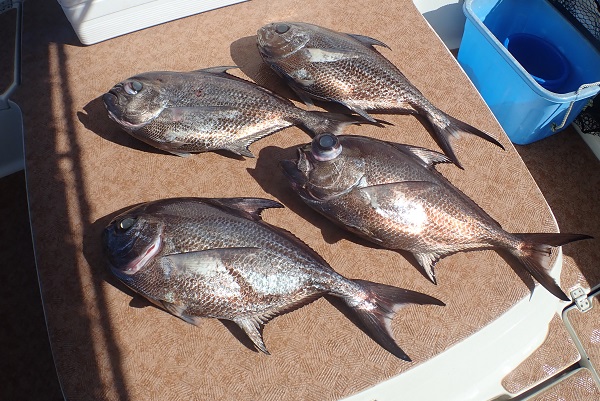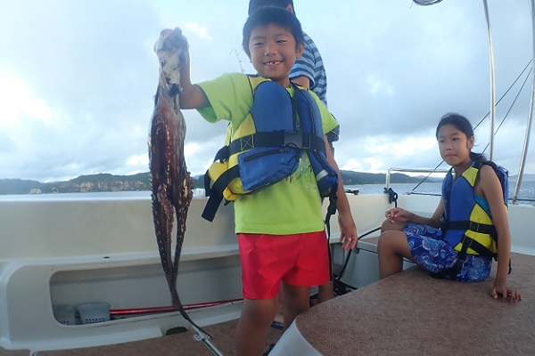 | 今日のサンセットは大人2名・子供4名の仲良しご家族です。みんなで夕食のBBQ用魚を釣ってきました。 サンセットとしては最大級?なミミジャーが釣れました。子供の笑顔が眩しいですね!!その後も美味しいお魚?がたくさん釣れて、 お刺身で抜群に美味いウメイロモドキ、そして水深30mでタコが釣れました〜。お魚にタコと最高のBBQ食材調達釣りツアーとなりました。 |