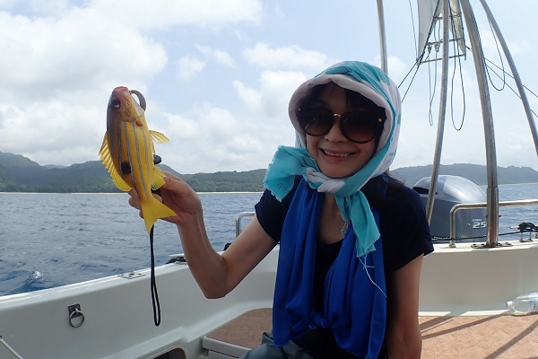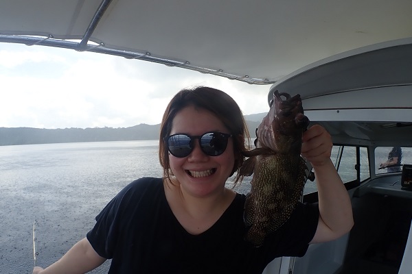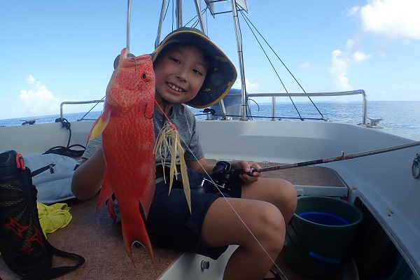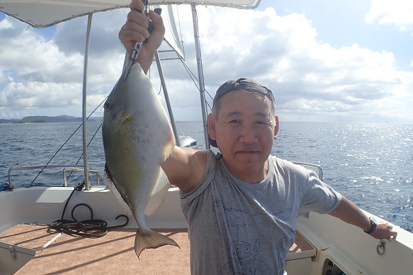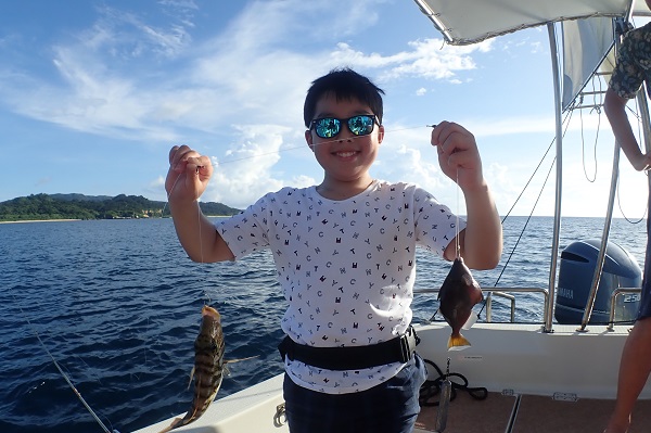 | 午後からは乗り合いの体験フィッシング。海が静かだったので、水深30〜60mまで流し釣りをしてきました。 浅瀬ではキツネウオ祭りでしたが、水深が深くなるにつれてウメイロモドキ・良型ムルー。ハタなど美味しいお魚連発です!! そして子供の引き運がとにかく凄い!美味しい魚は全て子供の方へ行ってしまいます。最後の最後は謎の大きなカワハギでした。 |