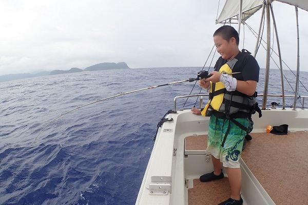| 今日のサンセットは少し波があるので船を走らせて5分の近場でスタートです。 ベラやカワハギ、キツネウオなどが釣れている中、ミーバイも数匹釣ることが出来ました。 残り2〜3投というところで、ドラグを出す大物がHIT!! イソマグロとしてはまだまだ子供サイズですが、子供が釣り上げた事がとっても嬉しかったです!水深30mの体験フィッシングでイソマグロ、持ってる子は持ってますね〜。 |