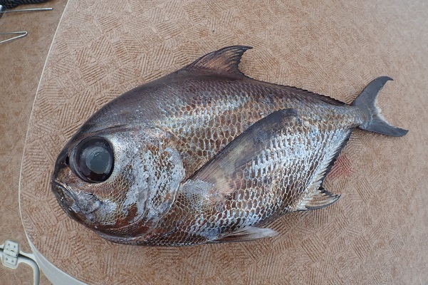 | 昨日よりも風・波共に落ち着き、気持ちの良い天気です。 常連さんと深海ドリームを求めて、水深500mで釣りしてきました。 水深520mでの1投目。着底後1分もしないうちに強烈なアタリ!上げてみれば美味しい通称エチオピアでした!こう見えて5kgはあります。 エチオピア以外にはキンメダイならぬギンメダイが1匹釣れたのみ・・。 深海釣りは何が上がってくるか分からないので夢がありますね〜。 |