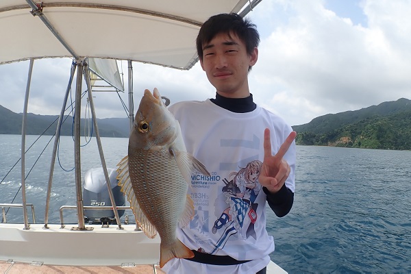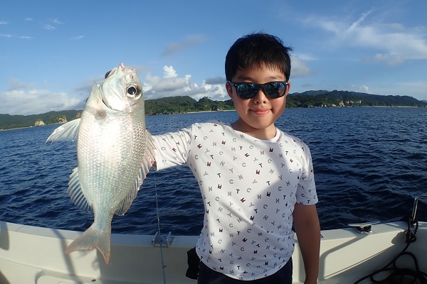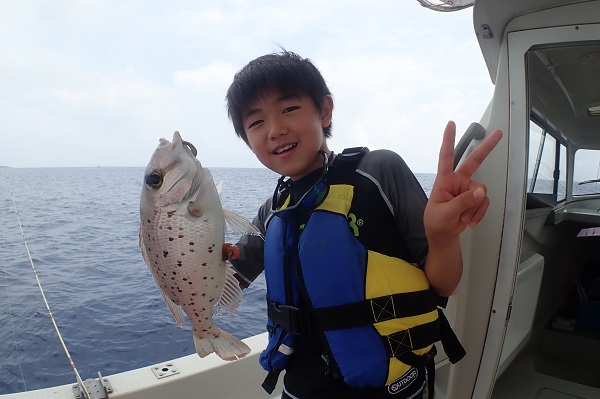 | 台風前ラストのサンセットへ。近くの島陰ポイントが静かだったのでまったりと釣りをしてきました。 フエフキダイやカワハギ、オジサンと潮に恵まれ入れ食い状態です。 そして、このポイント本命と話をしていたシロダイも、 お見事!お刺身で美味しいサイズを釣ってくれました。 船釣り初挑戦でしたが、しっかりと合わせを入れ、一人でリールも巻き、頼もしい小学生!来年も遊びに来てくださいね〜。 |