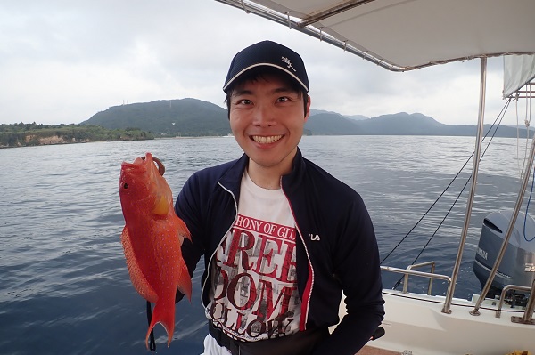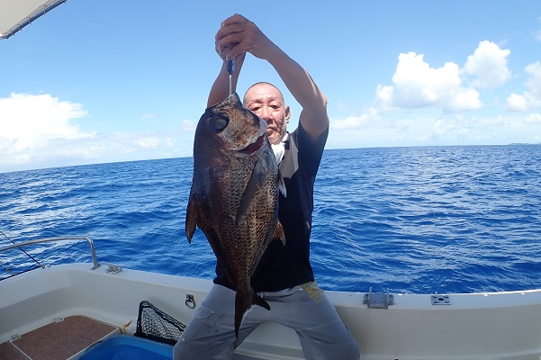 | 船釣り初挑戦にして、大物が釣りたいとのリクエスト。1日掛けて徐々にレベルアップをしてもらいます。まずは30m前後で、アタリのとり方、合わせ、リールの巻き方と練習してもらい本番ポイント60mへ。 シロダイから始まり、ウメイロモドキ、ムルーと良いサイズが釣れてきます。その後、大雨・強風・潮波に悩まされポイント移動の繰り返し。 よーやく静かな場所を見つけて、タイラバスタート! 開始早々良いサイズのシロブチハタやバラハタなどが釣れました。 一人で頑張っていたお兄ちゃんに今日一の大物HIT! ドラグを出す大物の正体は60cmクラスのキツネフエフキでした! 当初の目標サイズを大幅に超える大きさの魚が釣れ、安心した船長でした。夜は美味しいお魚食べてくださいね。 |