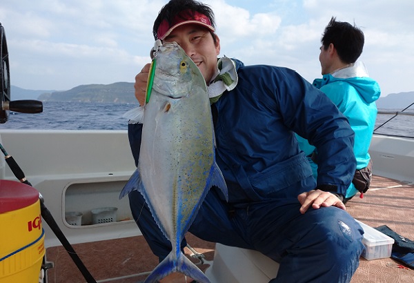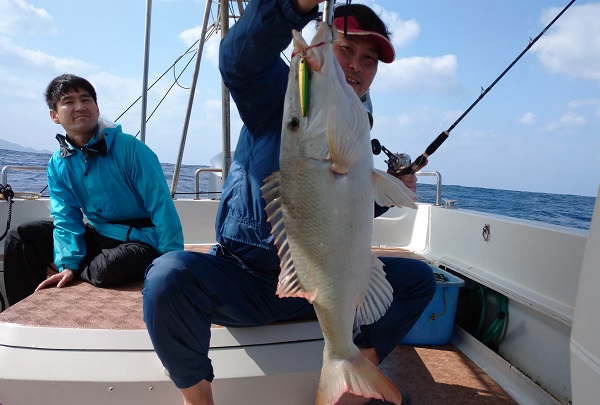 | この時期にしては珍しく強い南風。最高気温26℃と夏日です。 今日は沖へ出てカンパチ狙い。風が強いのでポイント限定で出船です。 実績ポイントをまわりましたが、最初の110mポイントではノーバイト。 その後、水深90mへ移動。本日のファーストフィッシュは良いサイズのシロダイです。立て続けにタイラバへ、 4〜5kgキツネフエフキを見事ゲット!おめでとうございます!! 風も強くなってきたので、浅瀬へ移動してミーバイ探し。 ミーバイを釣る予定でしたが、またしても良型キツネフエフキをタイラバでゲットとなりました。 その後は、バラハタやカイワリなどを追加して帰港となりました。 |