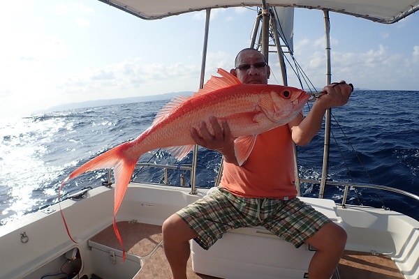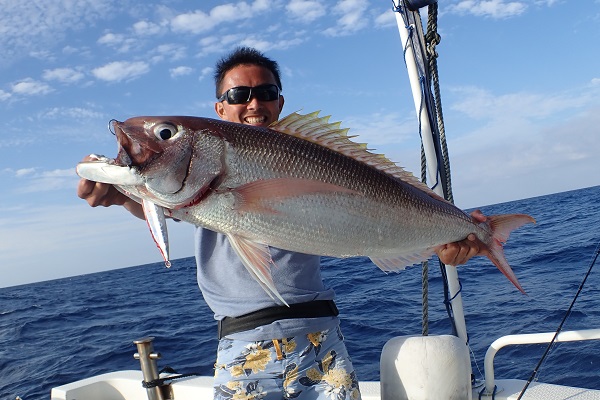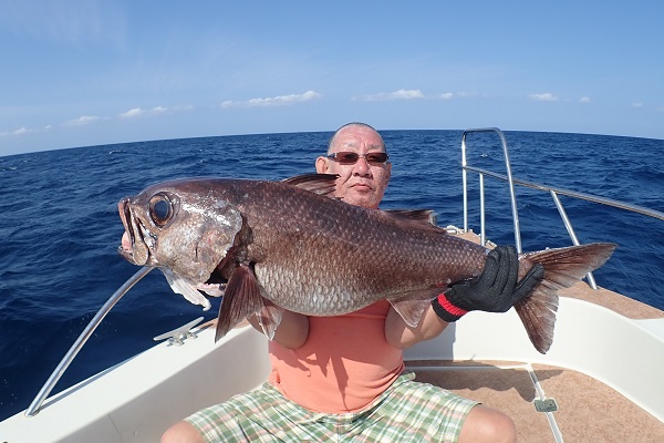 | 昨日よりも東風が強く、海もざわざわしている西表島。しかーし、釣りがしにくい時こそ魚は釣れます!今日も水深300〜500mで餌釣りです。 朝一の下げ潮。流れもほど良くあり、2投目で食ってきたのは5.2kgと立派アカマチです!大本命を早くも1尾頂きました。 その後も食いは続き、シマガツオ・ハチビキ・アカマチなどを追加し、最後の流しで今回本命の、 8kg超えのクロムツを見事仕留めました!!最後の最後に感動の1匹。 波がある中、2日間ありがとうございました。 |