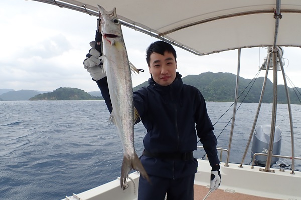 | 約3ヶ月振りに来島した常連ゲスト様。今回は週間予報を見て、海に出れそうな1週間をピンポイントで選んで遊びに来て頂きました。 ここ最近、あまり調子の良くない深海釣り。本命はアカマチ・クロムツと超高級魚狙いです。 本命のアカマチは1kg位の小さな個体が1尾のみでした。その代わり、1mオーバーのナガタチカマスとシマガツオのダブルヒット!! 明日も同じポイントで頑張りましょう!!! |