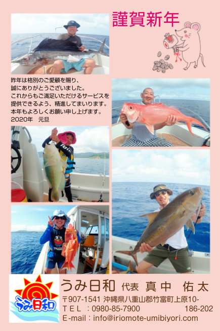 ![]() 新年あけましておめでとうございます。 うみ日和は今年で6年目に突入!安全・快適なツアーを心掛け、少年の心を忘れずに大物を探して行きたいと思います。 新しくチャレンジしてみたい釣り方・釣りたい魚などございましたらどんどんリクエストして下さい。 ボウズ覚悟の超大物狙いも大歓迎。今年も宜しくお願い致します。 |