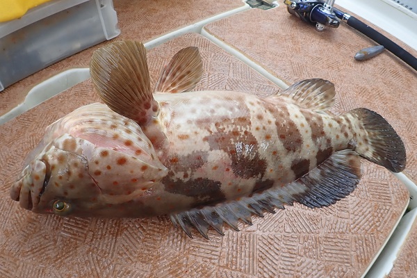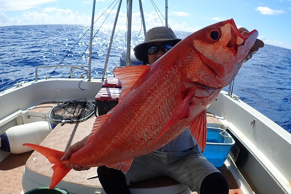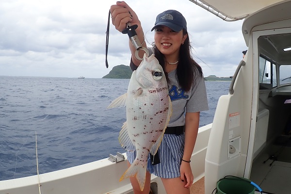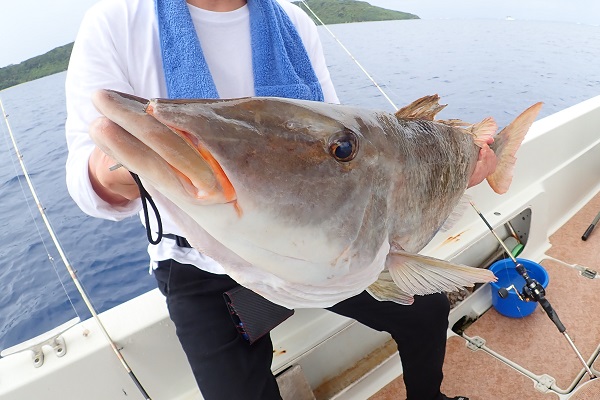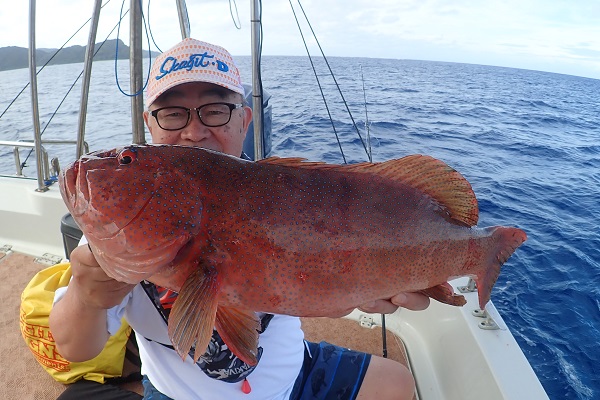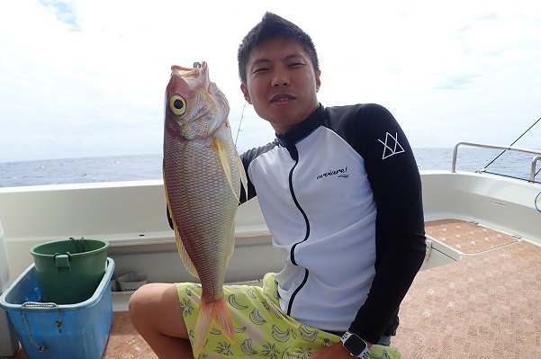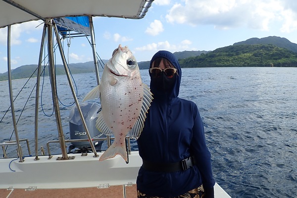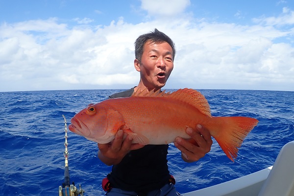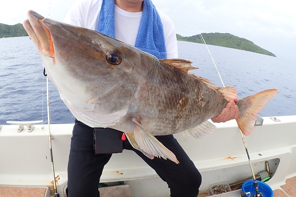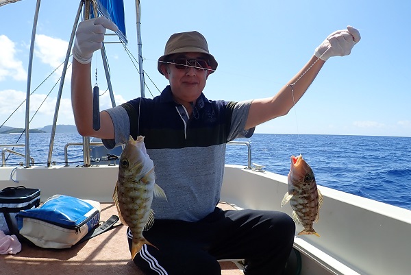 | 午後は船釣り数回目のお客様。大物狙いで気合十分です。 開始1投目にしてシロダイを釣り上げてくれました。魚の活性も良く、オジサンのダブルヒットなどありましたが、徐々に食いが悪くなり1時間ほど全く食べない時間が・・・。魚探の反応が良いポイントをランガンして、 なんとかフエフキダイ・アザハタなど食べる分は確保となりました。 |