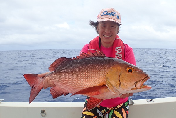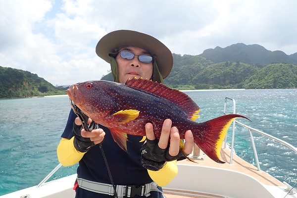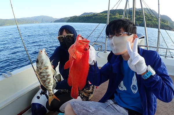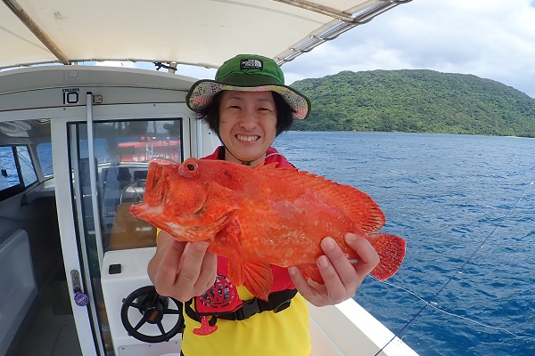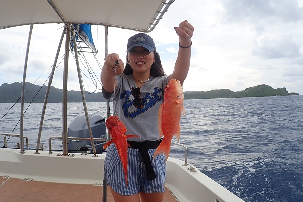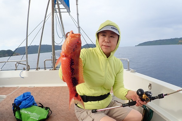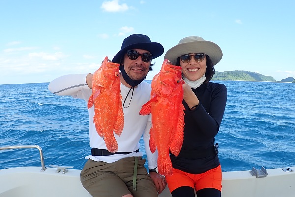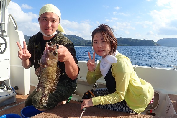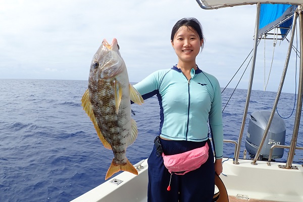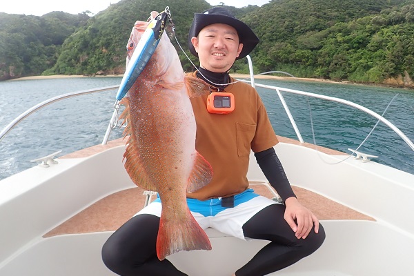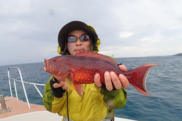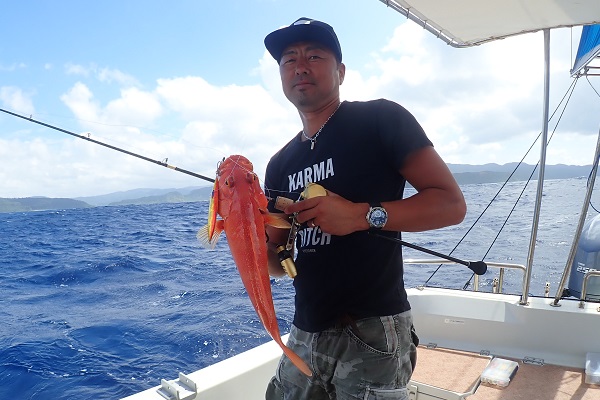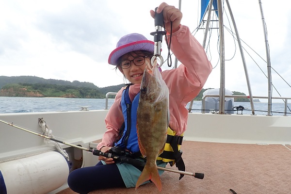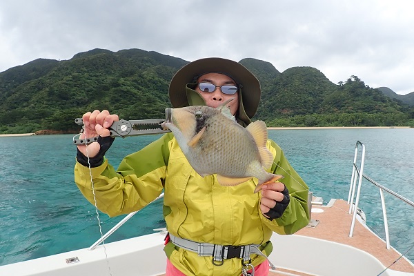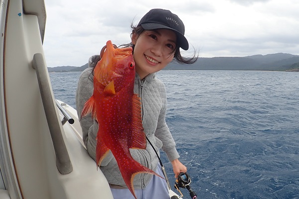 | 波も2mまで落ち着き、久し振りに上原航路が動くまで海況も回復しました。今日は午後から体験フィッシングへ行って来ました。 風は強いままですが、波もなく釣りやすいです。魚の活性はいまいちでしたが、水深40mポイントでメイチダイ見事ゲットです。その後はしばらく沈黙が続きましたが、 このポイントのメインターゲット、ナミハタを2連ちゃんで釣り上げてくれました!これだけ大きければ刺身・煮付けと美味しく食べれますね。 無事に夕食食材確保となった体験フィッシングでした。 |