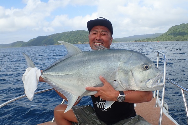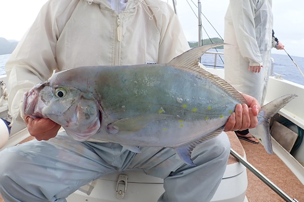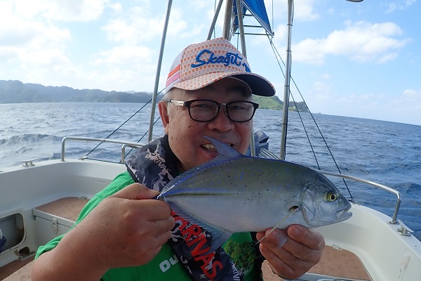 | 7月にも遊びに来て頂いた常連様が大物狙いに遊びに来てくれました!しかし波3m、最終日の今日は2時上がりとタイムリミット付き。 あまり遠出も出来ず、少しだけ沖へ出てジギング&湾内で自家製ソーキそばを食べてきました。 波が高く、思う様にジグが操れず&魚の活性も低くアカジンを2匹釣るので精一杯。アタリも時間もないので湾内の静かなポイントでランチへ。 ランチ後はそのまま静かなポイントでまったり釣り!のはずが良型ヨコフエダイ?が食い付いてきて写真撮影。その後ろで「食った!」からのドラグ音!強烈なファーストランを自由に走らせ、船で追いかけて、 またやっちゃいました、ロウニンアジ!!20kgはないかな!?PE2号・リーダー40Lbと細仕掛けでしたが見事釣り上げていただきました。 やはり持っている人は持ってます!人生2匹目のロウニンアジおめでとうございます。 |