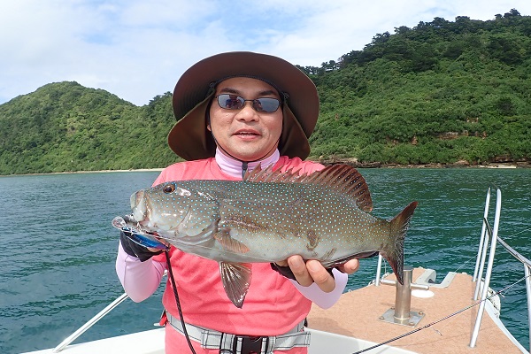 | 沖にうねりはあるものの、風は緩い東風の西表島。朝方は大雨でしたが、ツアースタート時には止み、リーフキャスティング日和となりました。 港を出て3分で着くポイント、わずか数投で食ってきたバラハタ。今日は魚の活性が良さそうです!! その後はニジハタ・アミメフエフキ・ベラなどの数釣りを楽しみ、ドラグを出す大物ヒットかと思われましたが、まさかのゴマモンガラ。 数釣りを楽しんだ後はサイズを伸ばすため少し深めのポイントへ! そして狙い通りにアカジンをいただきました!!明日は少し時化ますがアジ狙い、頑張りましょう。 |