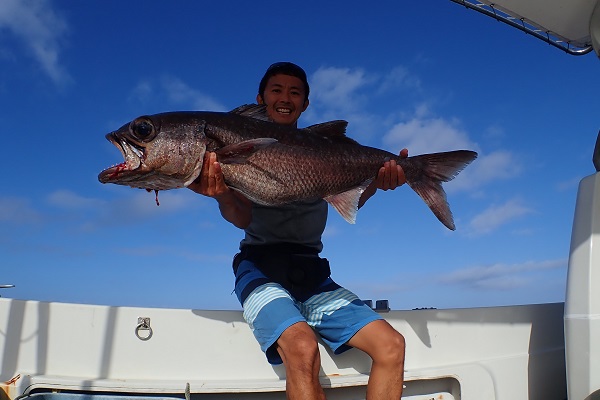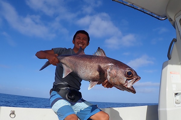 | 波2mの日が続いている西表島。待ちに待った穏やかな日、島の先輩方を連れて深海ジギングへ行って来ました。 水深530mから上がってきたのは8.5kgのジャンボなクロムツです!その後もアタリ連発で、 自己記録の9kgクロムツや2kg近いナンヨウキンメ!今日は深海魚の活性かなり高いです。先輩も深海釣り初挑戦でしたが、 6kgのナイスサイズアカマチを見事キャッチ!!PE2号を500m、リーダー40Lb、ジグはメジューム 300gと水深300mでの釣りとしてはやや軽めでしたが潮次第では釣りが成立します。挑戦者したいお客様、お待ちしております。 |