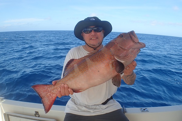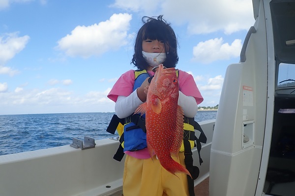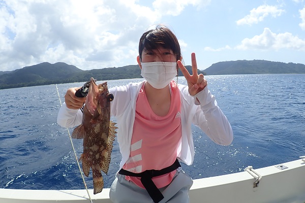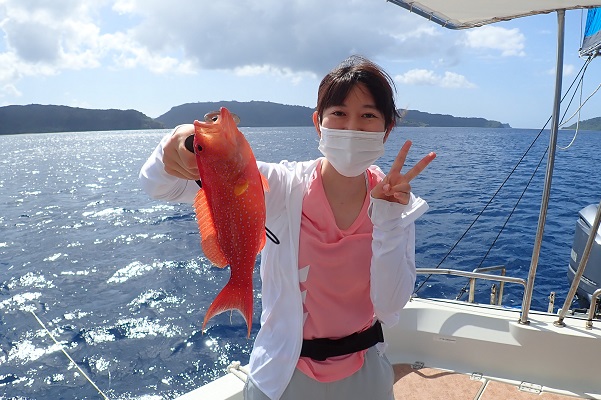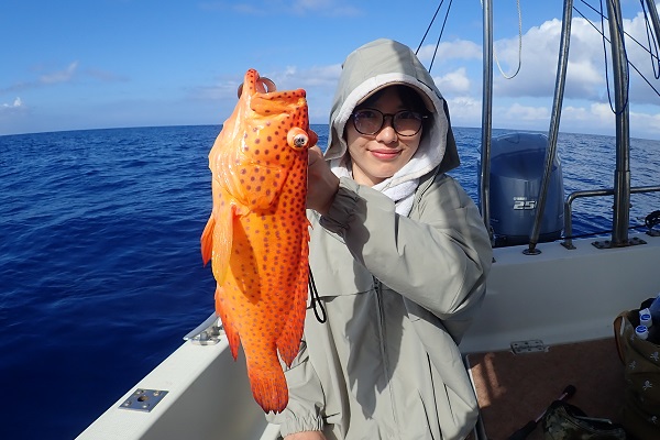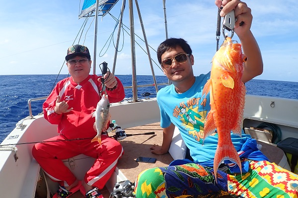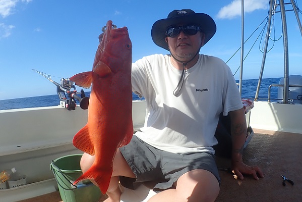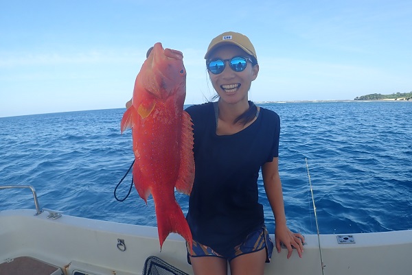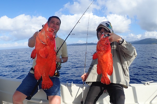 | 今日も強風の西表島です。本日のゲストは久し振りの家族連れをご案内です。釣れた魚を食べたいとリクエストなので、居酒屋をあらかじめ予約して行ってきました。 魚の活性も良く、ハタ類が中心に釣れました!その中でも最初にキープしたのは真っ赤なユカタハタ!その後もハタが釣れ続け、 40cm超えの立派なバラハタまで釣れちゃいました!お刺身サイズ、煮付けや唐揚げ用と夕食食材としては十分な量を無事に確保。美味しい夕食を楽しんで下さいね。 |