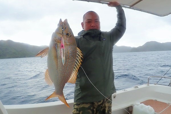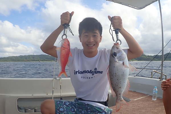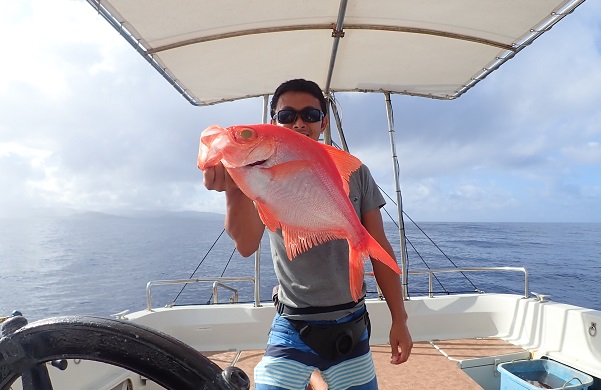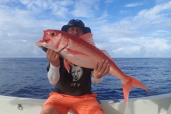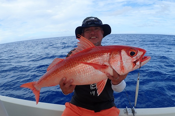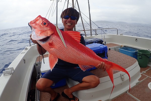 | 台風20号の影響もなくなり、風・波共に穏やかになってきた西表島です。今日は一昨日の常連さんとグルクン泳がせ釣りへ行って来ました。 開始早々からアタリ連発でしたが、早合わせやすっぽ抜けなど色々なバラシを一通りした後にキャッチしたコクハンアラ!お見事でした!! その後、食いが悪くなってきたので水深90〜100mラインで根魚以外の魚探し。しかし全く反応が無いので再びアカジン狙いへ。 水深40mで真っ赤なアカジンを見事ゲット!食いが浅く、合わせるタイミングが難しい1日でしたが、なんとか2匹キャッチ。明日はさらに波が穏やかになるので、楽しみにしていた深海ジギングです。 |