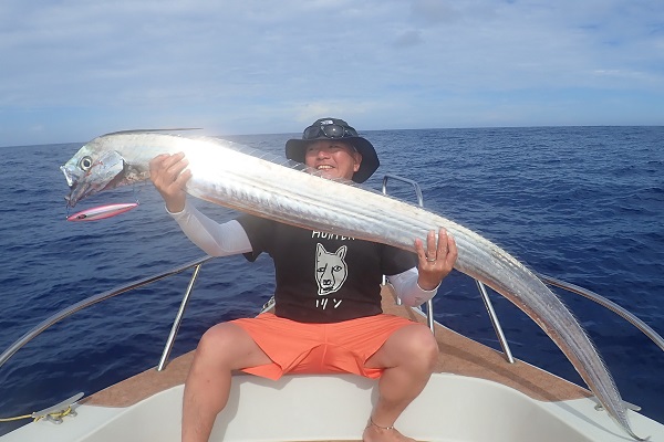 | 約1ヶ月振りに波2mまで落ち着いた西表島。今日は常連さんと深海ジギングへ。今回の為に用意してもらった600〜800gのジグを持ち、水深200〜450mで化け物探しへ行って来ました。 ポイント到着1投目にして食い付いてきたオオクチハマダイ。着底後、2しゃくり目のフォールで見事ヒット!その後は更に深いポイントへ行き、 水深420m、ジグ800gのスパンキーにアタックしてきたのは、2m超えのヒレナガユメタチです。とっても活性が良い今日、良型カンパチ狙いで水深250mへ行き、 6.5kgの立派なオオクチハマダイをシャウト STAY 300gで見事キャッチ!その後も欲を出し300mで粘りましたが1バイトノーキャッチ。 1日にいったい何メートルリールを巻いたのか?釣れたからこそ心地よい疲労感。3日間ありがとうございました。また来年お待ちしてます! |