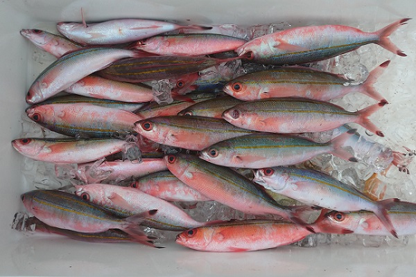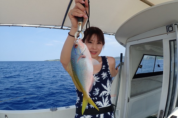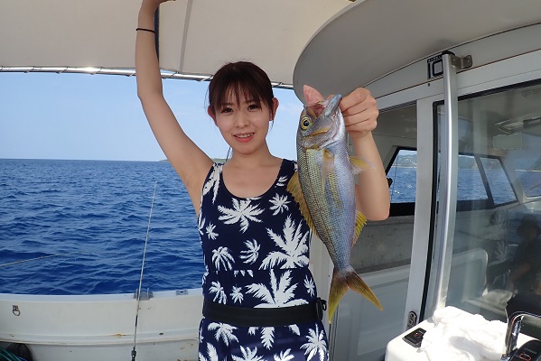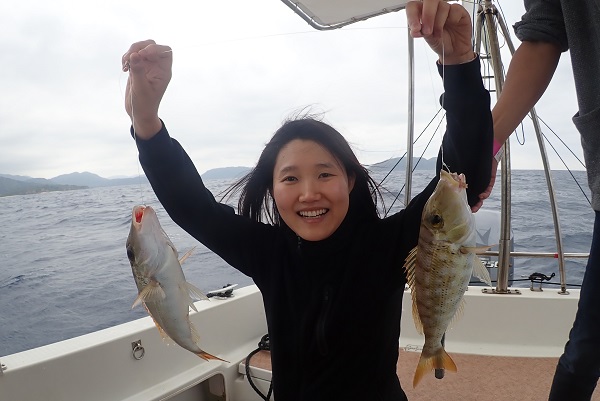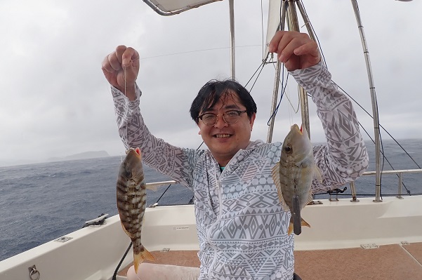 | 風もうねりも緩み、とっても気持ちの良い海況がやってきました。 今日は午前:体験フィッシング、午後:チャーターコースです。まずは午前中の様子から! 乗り合いでの体験フィッシングになりましたが、最初の1匹目はホホアカクチビでした。引きも強く楽しませてくれるお魚です。 午前中一の大物はナガジューミーバイの35cmでした。後ろでは夫婦仲良くダブルヒットでした。 |