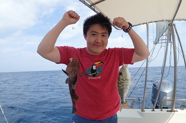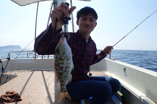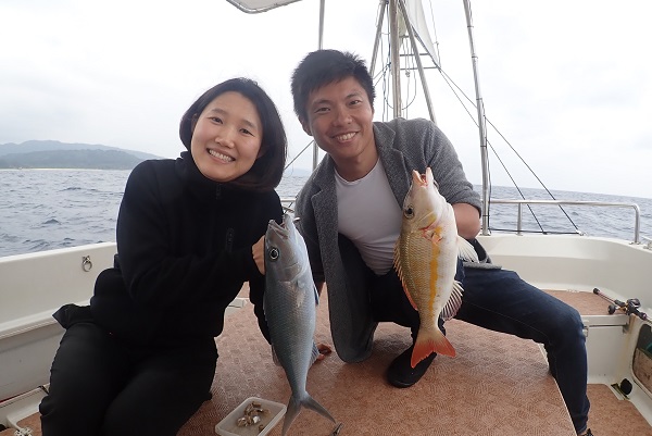 | 最高気温27℃、湿度80%超えのジメジメとした夏日がやってきました。 今日のゲストは春休みらしく3歳・6歳のお子様がいるご家族でご参加いただきました。水深30〜40mで体験フィッシングです。 潮の流れも緩く釣りやすい日でしたが、魚の活性はまだ低め!? やっとのおもいでナガジューミーバイを釣り上げました!!妹ちゃんにも頑張ってもらい、 オジサンとフエフキダイのダブルヒットです!!お昼頃になり風も強くなってきたので、干潮のタイミングで帰港となりました。 釣れた魚は居酒屋へ持ち込み、夕食として頂きます。ぜひまた遊びに来てくださいね〜。 |
