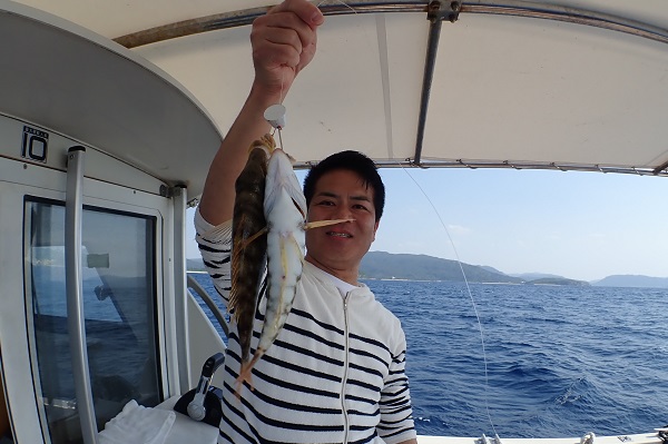 | 時化もおさまり、今日から外海に出て釣り再開です!! 今日のゲストは釣り好きお父さん&お魚博士の息子さんです!初挑戦のタイラバとテンヤで大物を狙ってきました。 開始早々食い付いてきたのは、巨大なフグ!即リリースして、その後にヒットしたのは良型フエフキダイです。お父さんも負けじと、 フエフキダイのダブルヒット!餌ではフエフキダイは簡単に釣れ、時にナガジューミーバイが混じったりと良い潮でしたがお目当ての大物には出会えず帰港となりました。是非またリベンジお待ちしております。 |