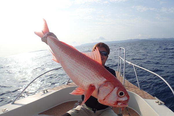 | 波1m、緩い南風と最高のうみ日和がやってきました。今日は温めいていたポイントで深海ジギングです。280〜400m、ジグの重さは350〜500gを使い赤くて美味しいお魚を狙ってきました。 一流し目でヒットしてきたのは7kg超えのオオクチハマダイです。 PE2.5号、リーダー14号、ジグ450gのアカキンゼブラグローで見事釣り上げてもらいました。その後も1バイトありましたが、残念ながら途中で外れてしまいました。 餌釣りも同時に行い、ハチジョウアカムツ・アカマチ・シマガツオ・ハチビキなど型も良く、美味しいお魚ばかり釣れました。 |