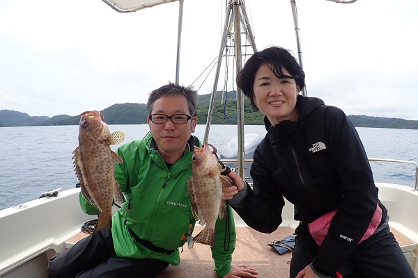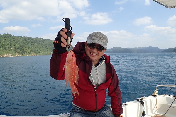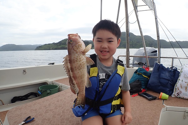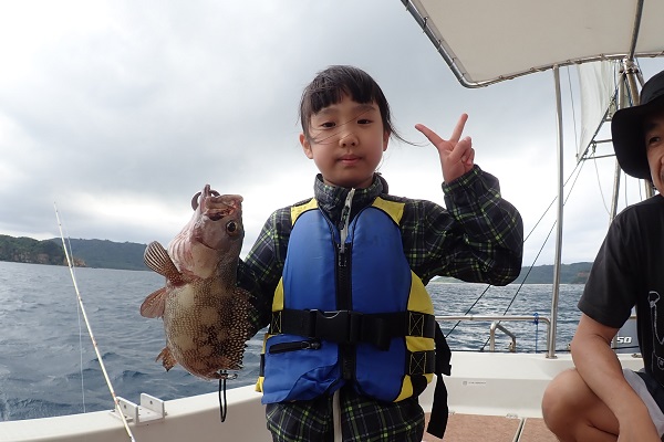 | 午後からは、居酒屋を予約してご参加して頂いたご家族。夕食の食材となる美味しいお魚を狙ってきました。 予報とは全く違う海況にポイント選びは苦労しましたが、浅瀬で美味しいお魚「ハタ」狙いでアカハタを見事ゲット!! 妹さんもお姉ちゃんに負けじと一人ずっと頑張っていて、念願の 立派なナミハタを釣り上げる事が出来ました。その後、アタリも徐々に減ってきて、沖からはいやーな感じの雨雲が迫ってきたので少し早めの帰港となりました。次はもっと大きいの狙いに行こうね。 |