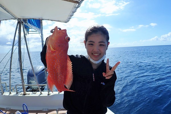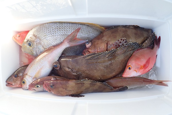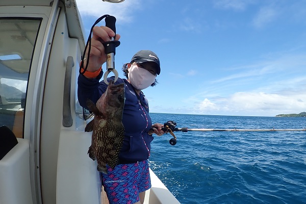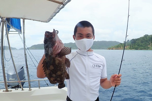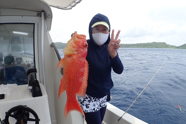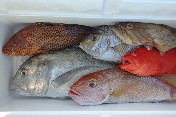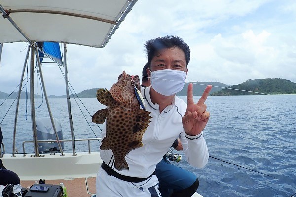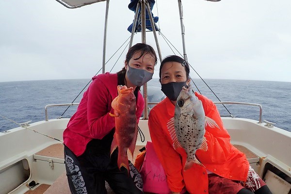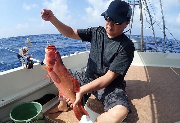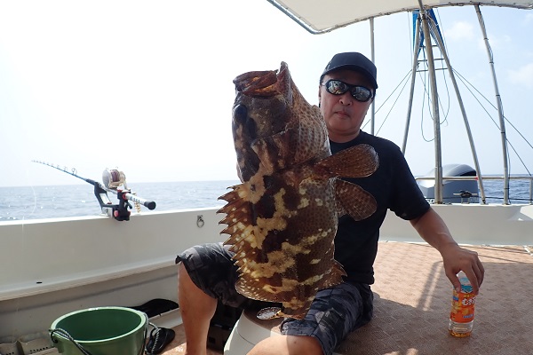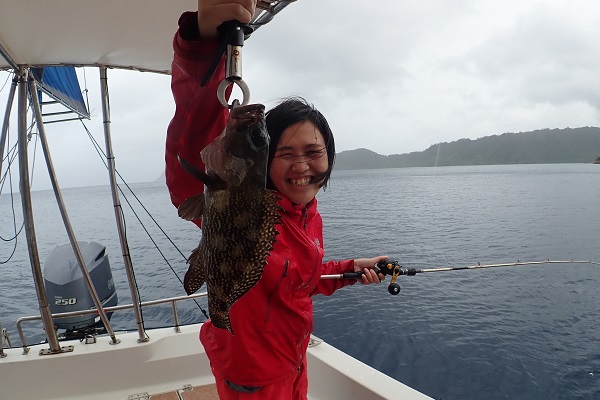 | 台風5号も通り過ぎて穏やかな海に戻るかと思いましたが、今度は台風6号が台湾の西側で発生!その影響なのか、大雨&強風です。 赤い魚がリクエストでしたので、アザハタポイントで見事赤い魚をゲット!その後も、タイラバと餌釣りで、 雨が降っては止んでの繰り返しでしたが美味しいお魚を続々と釣り上げてくれました。 |