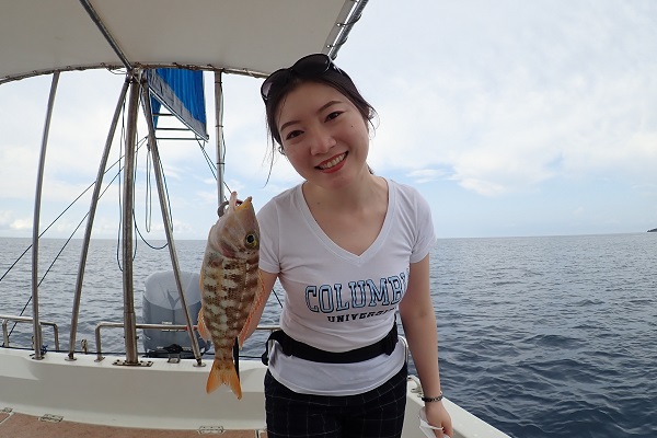 | 宿泊先へお迎えの1時間前、空は真っ黒くなり、冷たい風が吹き始めたと思ったら大雨&雷となり、ツアー開始時間を遅くして本日は出船。 今日はあらかじめ居酒屋を予約して、夕食の食材探しに行って来ました。 まずは体験フィッシング定番のムルーを数匹釣り、最低限の食材確保。 魚の活性は高くはありませんでしたが、時々大きな魚のアタリもあり、 ハタとしては珍しいコクハンハタのBIGサイズ!と、お刺身サイズのシロダイを見事ゲットとなりました。大雨の時はどうなるかと思いましたが、大雨の後の凪に助けられた日となりました。 |