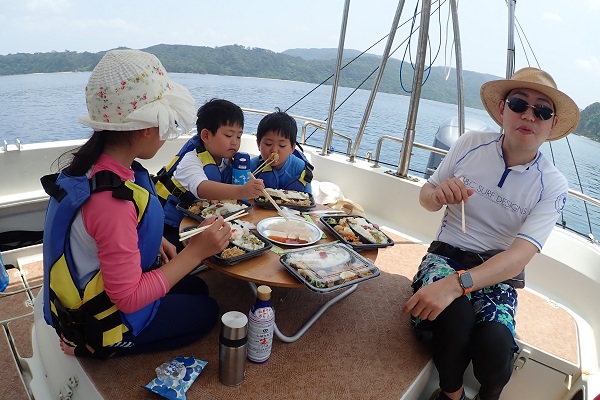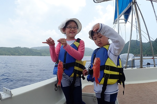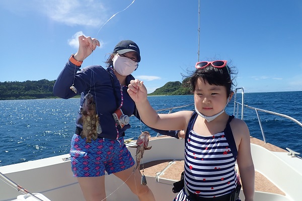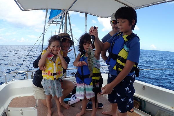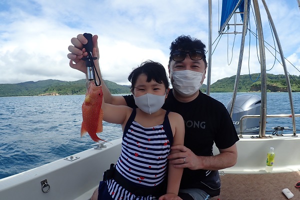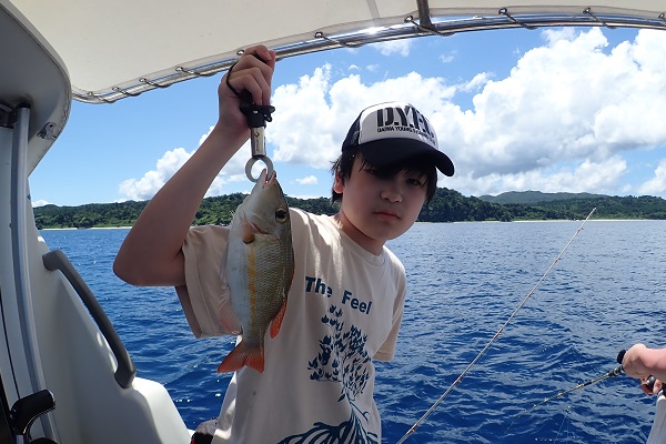 | 今日も波1m、風も緩い東風と最高のうみ日和が続いています! 本日のゲストは、去年釣りに来て頂いたお客様よりご紹介頂きお越しいただいたご家族です。居酒屋を予約して、美味しい魚を狙ってきました。 5分に1回の兄弟喧嘩、急に仲良くなったりを繰り返しながらフエフキダイ・キツネウオ・バラハタなどが釣れました。とびっきりでかい魚は姿を見せず、次回のお楽しみとなりました。また遊びに来てくださいね〜 |