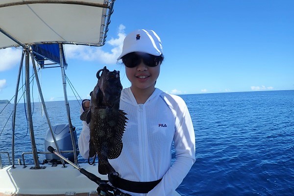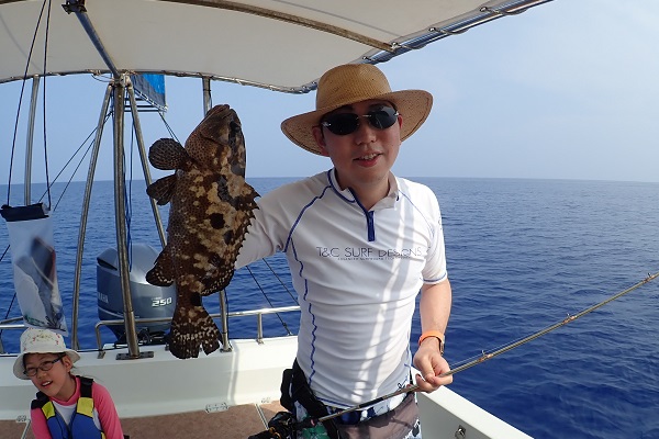 | 午後は船釣り初挑戦のご家族。少し船酔いが心配との事で、波のないポイントまで行きミーバイ狙いに行って来ました。 開始早々アカハタ・オジロバラハタ・ニジハタなど数種類のハタゲットです!しかしこのポイント、大本命は大きなナミハタです。 今日はお母さんの一人勝ちでした!!本命のナミハタは全てお母さんが釣り上げてくれました。美味しい夕食楽しんで下さい。 |