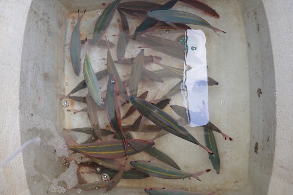 | 今日のゲストは島内ホテル勤務のメンバーが遊びに来てくれました。 ターゲットはタイラバでハタやシロダイなどの美味しいお魚です。 風・潮の流れ共に良い感じにあり今日は釣れそうな雰囲気!しかし、水深90〜110mまで色々なポイントをまわりましたが全くアタリなし!! 水深50m前後に移動をしたら良型シロダイ、バラハタにフエフキダイなど数釣りも出来ました。潮が止まったタイミングでグルクン釣りへ。 わずか1時間ほどで50匹以上の大漁でした。明日はこのグルクンを餌として泳がせ釣り予定です。 |