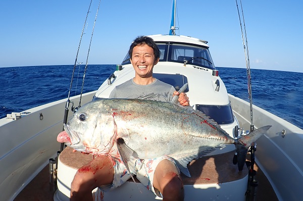 | 今年初めてのプライベートジギング。波2m、気温22℃と最高のうみ日和です。久し振りに鳩間島方面へ行って来ました。 朝一のとっても大切な時間は水深300mでアカマチ狙い!しかし、全くバイトがなく水深120mへ移動。移動後の1投目でアカジン、2投目でまたアカジンとベイト反応も良く魚の活性も期待できます。 と、ここで強烈なバイトからのドラグが50mは出るファーストラン。 誰もがサメだと言い、迷惑がられながらもやりとりを続け、見えてきた魚影は明らかにギャフが必要なサイズの、 24kgのロウニンアジでした!PE2.5号・リーダー12号と決して無茶は出来ないタックルでしたが久し振りの超大物、満足の1日となりました。 冬のジギングは大物や美味しい魚を釣るチャンスが見込めます。 タイラバとジギングを同じポイントで行なうことも可能ですので、チャレンジお待ちしております。 |