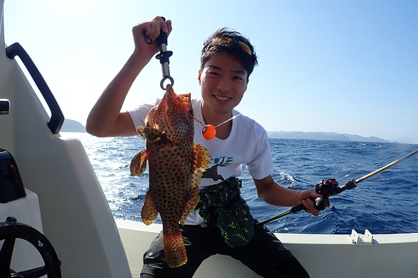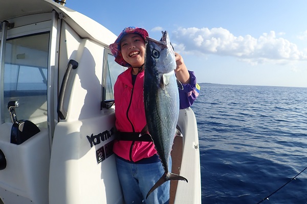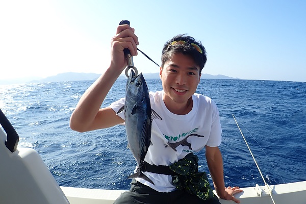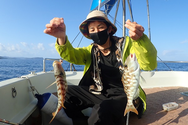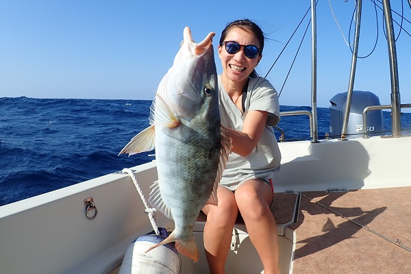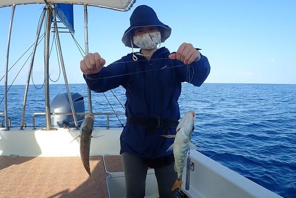 | 釣り初めての方と、船釣り数回経験者の混合チャーターツアー。 初めての方は餌釣り、経験者はジギングで大物狙いです。 魚の活性も良く、ダブルヒットが当たり前の今日。フエフキダイの型も良く期待大です!そんな中、ジギング初挑戦の女性アングラーへ強烈なバイトがあり、 ジギングでのファーストフィッシュはイソマグロでした!初めてでこのサイズ、おめでとうございます。その後は、 岸からこんな近くのポイントでイルカの群れに遭遇。釣りよりもイルカの群れに興奮のツアーとなりました。 |