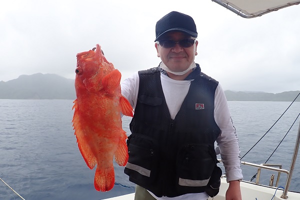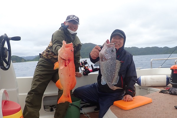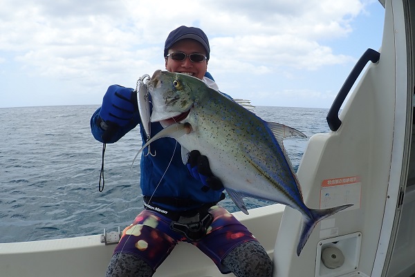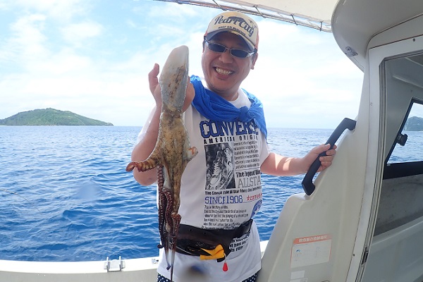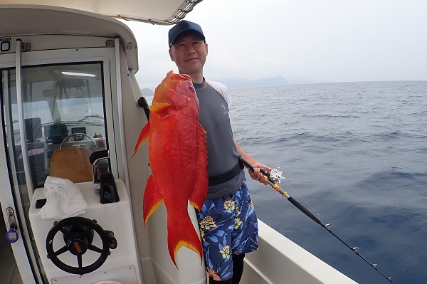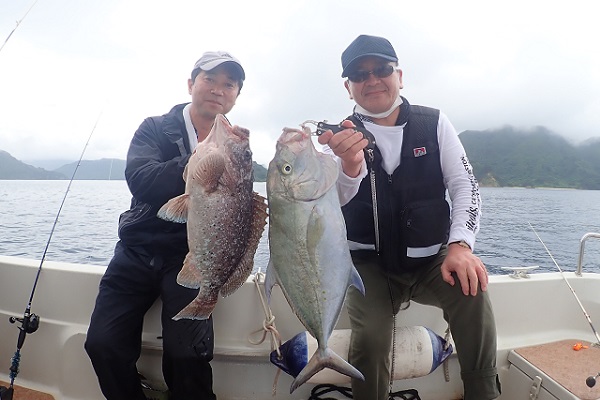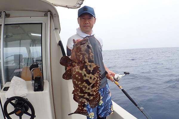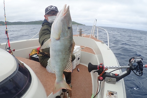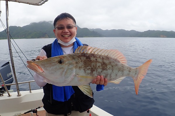 | 朝から雨模様の西表島です。波は1.5mの予報ですが北風と嫌な風向き。常連さん達と1日タイラバで美味しいお魚を釣りに行って来ました。 今日のファーストフィッシュは40cm程のアザハタです。しかしこのアザハタ、身体の真ん中に魚の噛み痕付き!水深70mから40mほど他の魚がくわえて上がってきていました。残り30mの所で放してしまい海底へ戻っていきました。お客さんも船長もなかり悔しい1尾です。 その後もキツネフエフキ・ツチホゼリ・ナンヨウカイワリ・アザハタが複数と美味しいお魚をたくさん釣り上げていただきました。 今日一番驚いたのは水深80mのポイントでタイラバにタコが食い付いてきたこと。美味しい食材追加で大満足の釣行となりました。 |