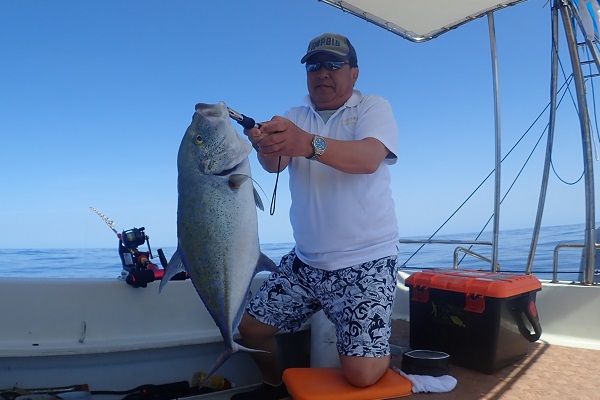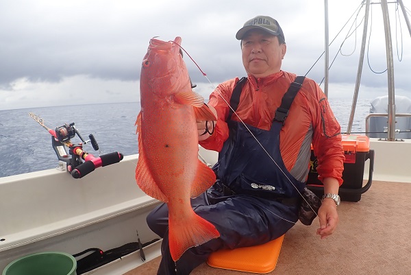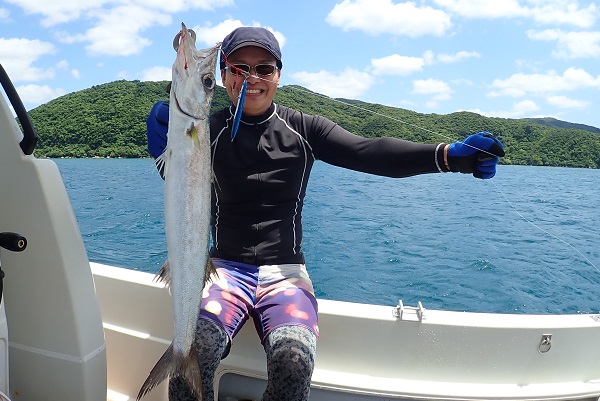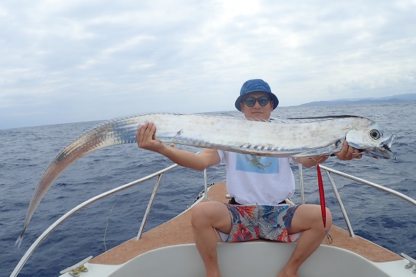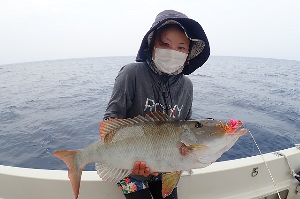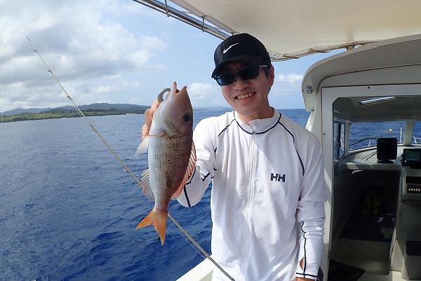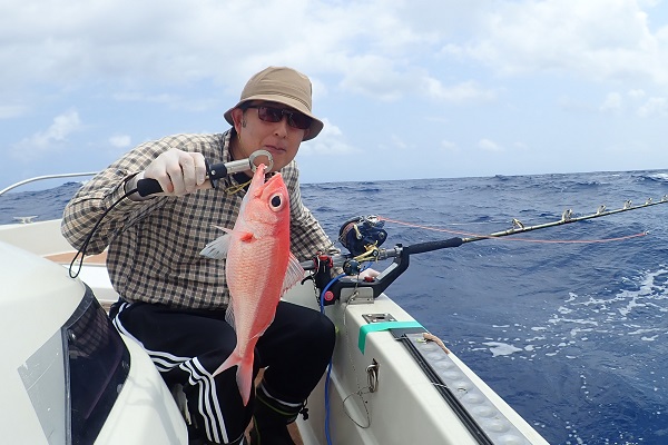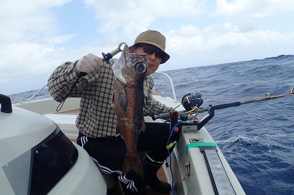 | 波2.5〜3m、風は東〜北東の緩い風と、波は高いが沖へ出れる海況。 本日はアカマチをジギングで狙ってみたいとのことで、少し波はありましたが水深300mで500gのジグをしゃくってきました。 開始1投目からバイトがありましたが、フォール中でリーダーから切られ、2投目にして6〜7kgの良型オオクチハマダイが着底直前のフォールでバイト!うねりが大きく、ばれやすい状況でしたが経験でカバー! ポイントを入れ直して3投目。また着底直前で強烈に食いあげるバイト!本命のアカマチかと思いましたが、 2mクラスのヒレナガユメタチでした!普段は相模湾で中深海ジギングを行なっているゲスト様。潮に恵まれ、西表島の化け物と無事ご対面することができました。次回は本命アカマチの顔を拝みましょう! |